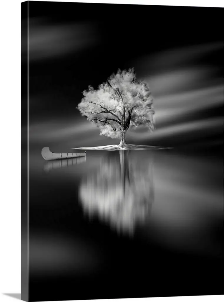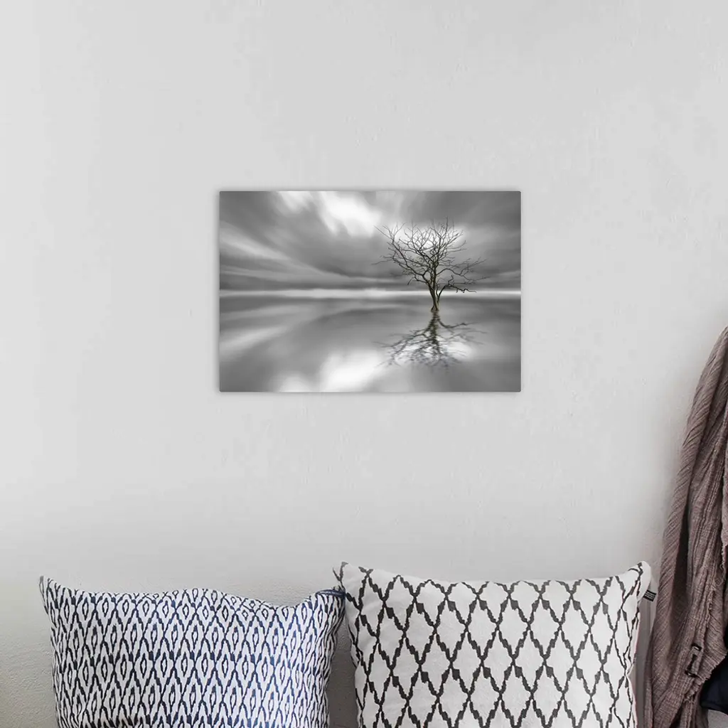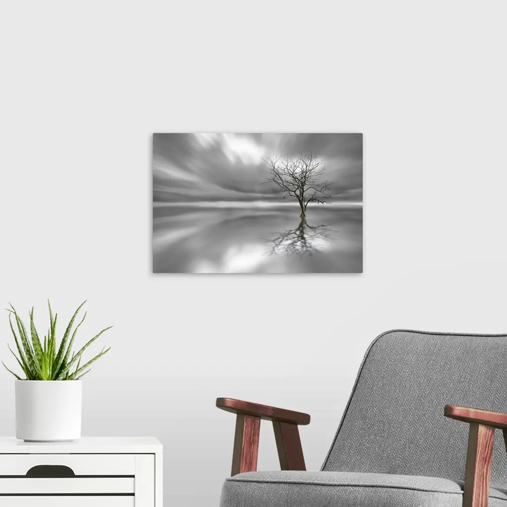 A lone tree stands strong in a still watery landscape casting mirror-like reflection.