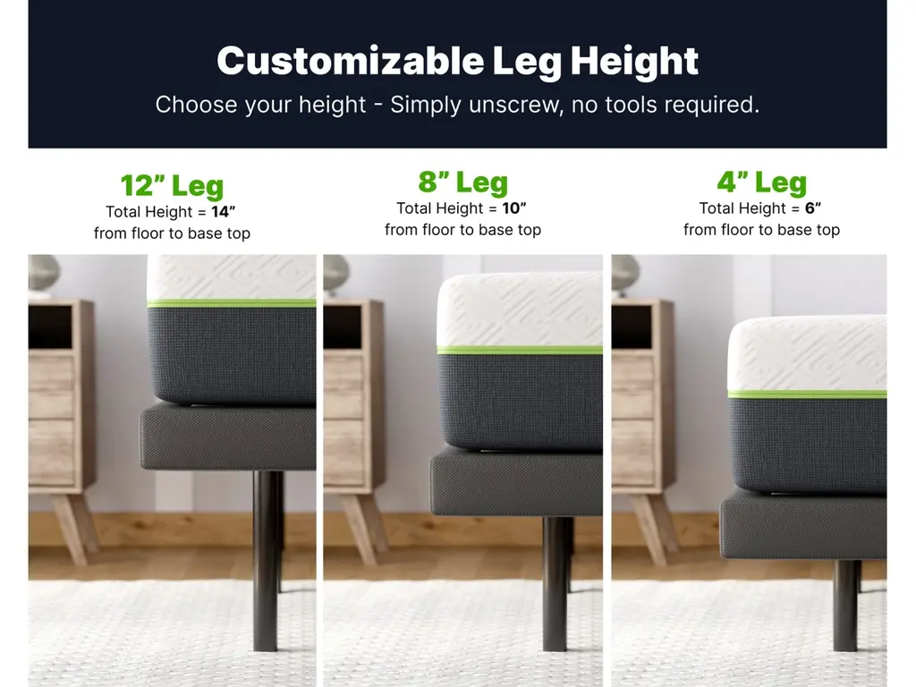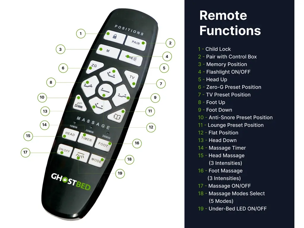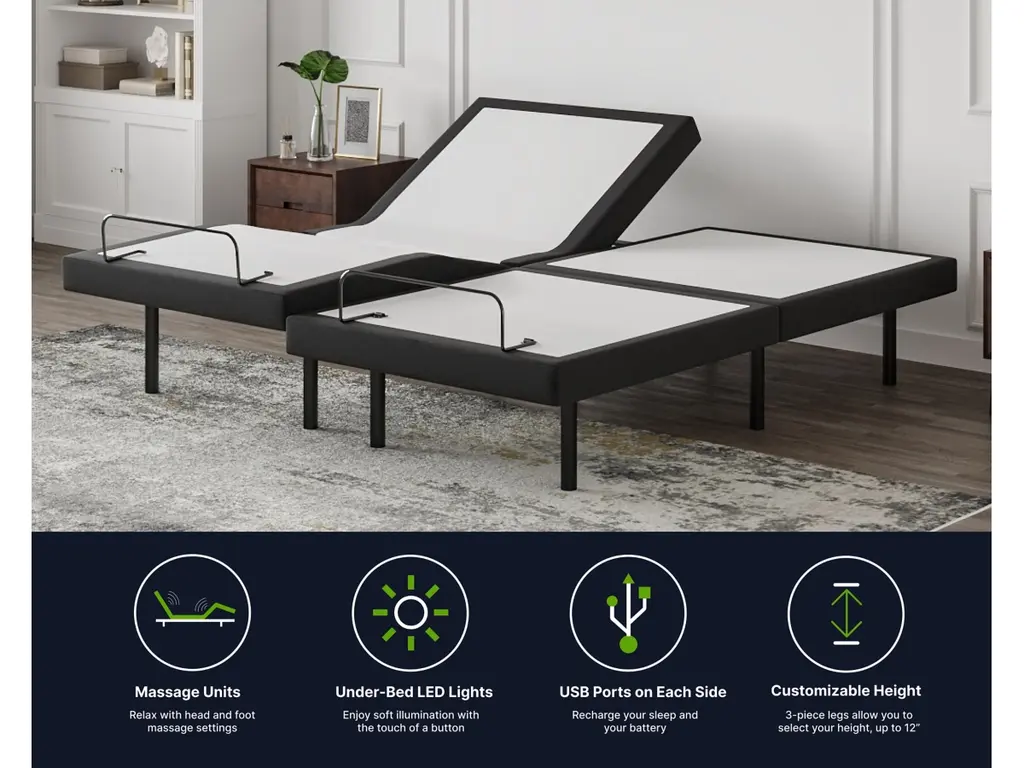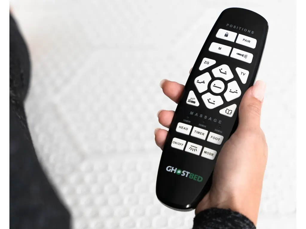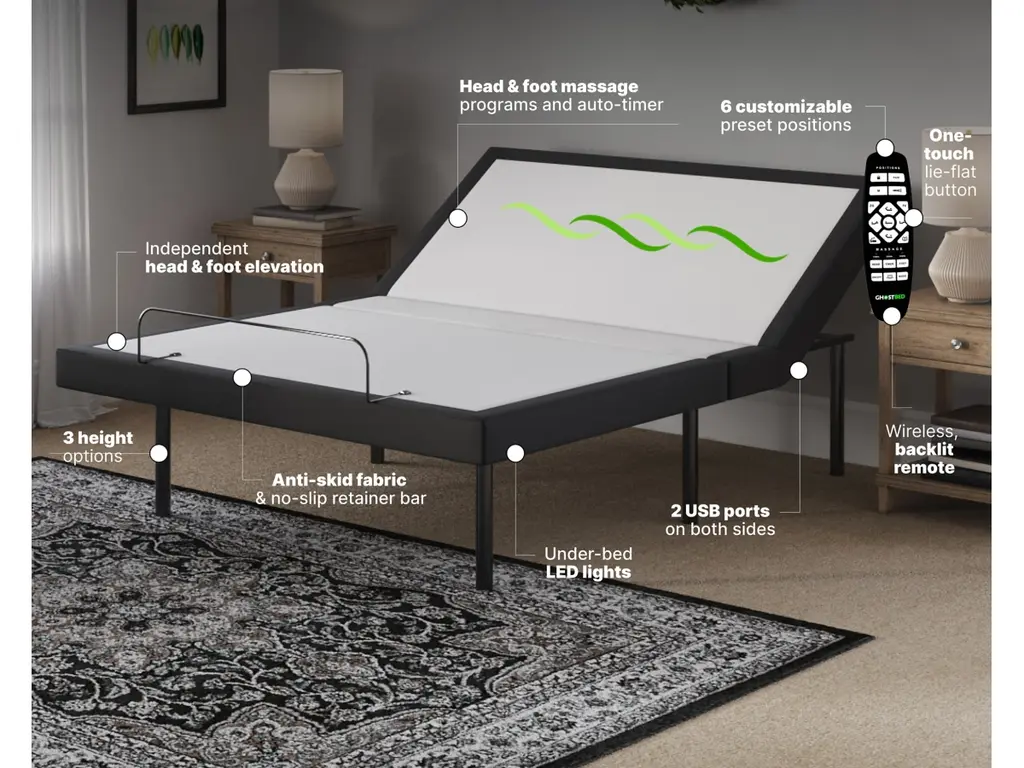 Relax in style with the GhostBed Adjustable Base, featuring full head and foot adjustability, 6 preset positions, whisper-quiet massage technology, under-bed LED lighting, USB ports, wireless remote control and more.