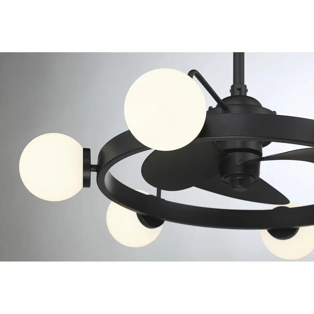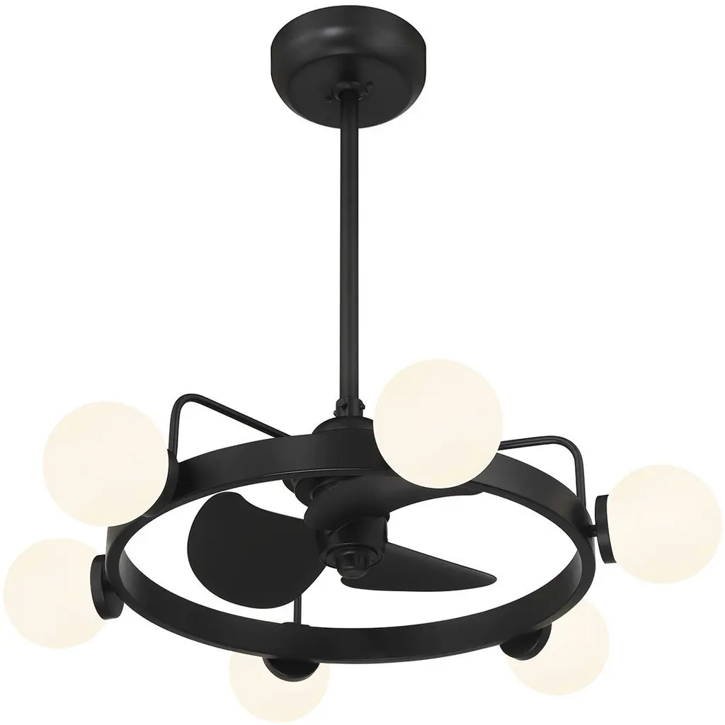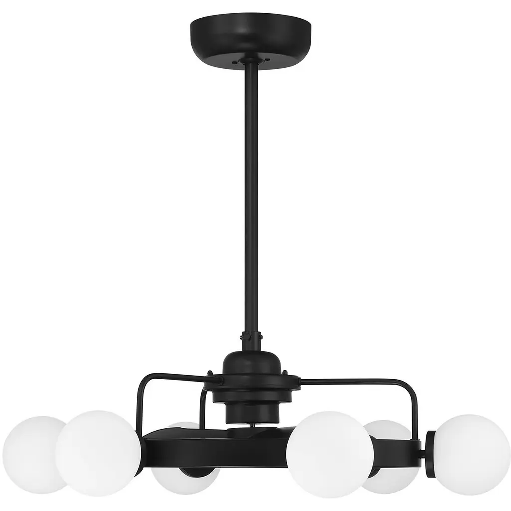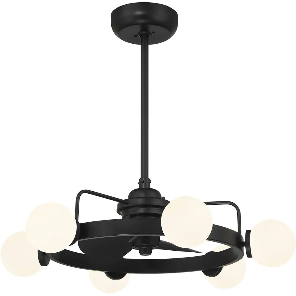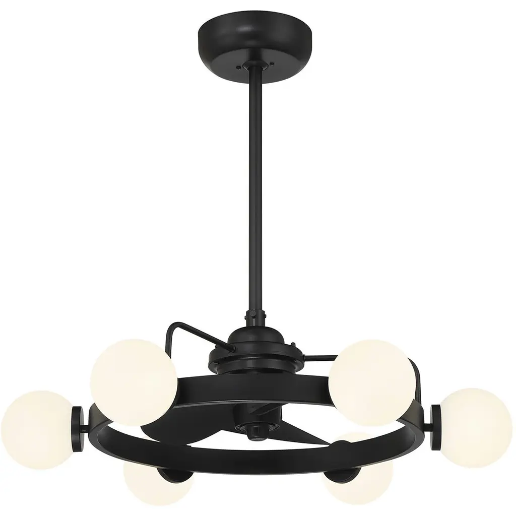 The ultra-cool Savoy House Gibson 6-light Fan D'Lier brings a touch of midcentury modern pop to any room with its globes of opal glass and its Matte Black finish. Integrated, dimmable LED light brings bright and useful light while the DC motor brings efficiency. A handheld remote control is included for extra convenience. Gibson is 30" in width and 10" in height. Comes with a 4" downrod and an 18" downrod. Fan D'Liers are a Savoy House exclusive that combines the best of ceiling fans with the best of chandeliers in one fabulously fashionable fixture. These custom designs are inspired by high-end designer styles and take top trends to a whole new level.