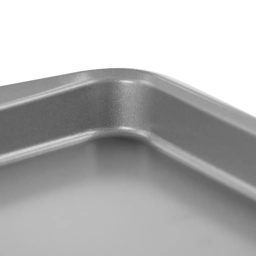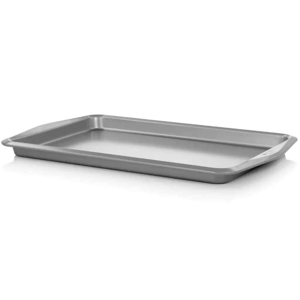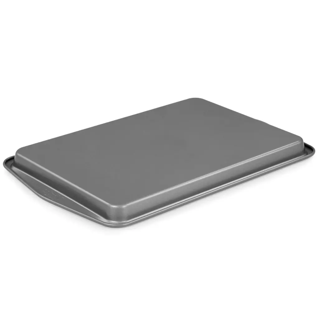 Bake all your favorite cookies with the Gibson Cookie Sheet. Whether its cookies or roasted veggies, make this the perfect addition to your kitchen and treat all your friends and family. Made of pure carbon steel that heats evenly for consistent baking results. The long lasting nonstick interior coating makes food release and clean up super easy. Medium grey color absorbs heat and promotes even browning. The wide handles and rim provide a comfortable grip.