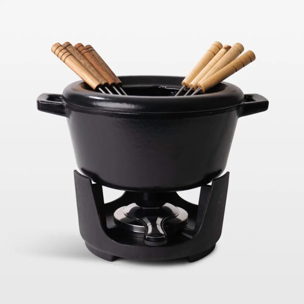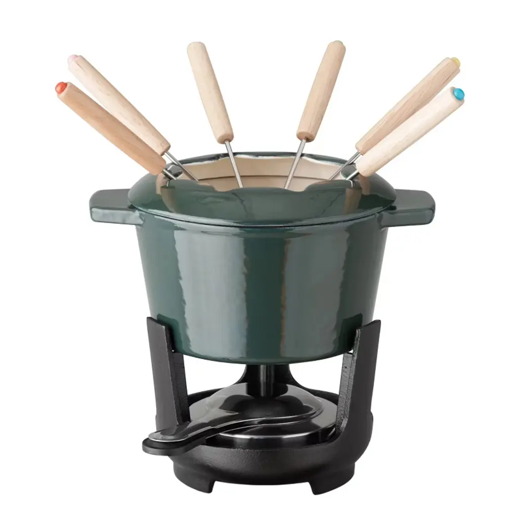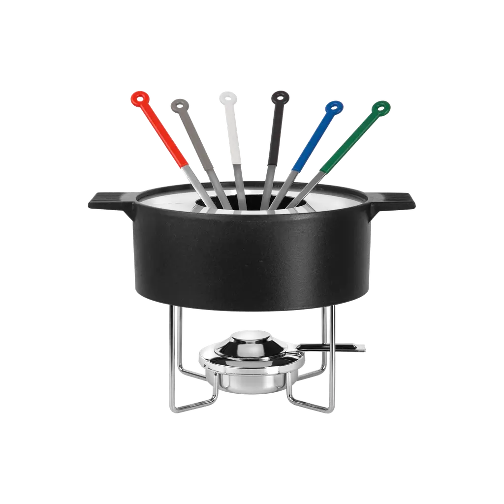 Bring the delicious and classy fondue experience right to your home with this Our Table 13 Piece Enameled Cast Iron Fondue Pot Set. This set has everything you need including cast iron pot with lid, cast iron stand, 6 color-coded forks, 3 piece chrome burner, and snuffer. Durable cast iron construction allows for even heating and optimal heat retention, and an enameled interior allows for super easy clean up. The pot is even oven safe up to 500° F for more cooking options. With 6 color coded forks, your friends and family will have a great time with this fondue set perfect for cheese, chocolate, and more!