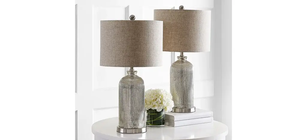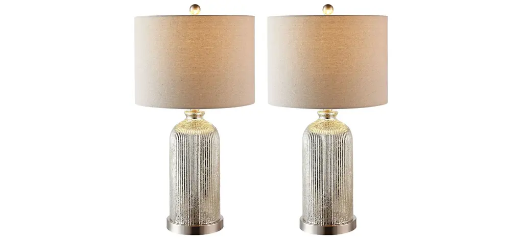 Dramatic and bold, this stylish contemporary Gibson Table Lamp Set brings rich texture to any living room. Expertly crafted with sophisticated mercury glass, designers love its luxurious materiality. Its neutral, complementary beige shade blends with any d_cor. Sold in sets of two.