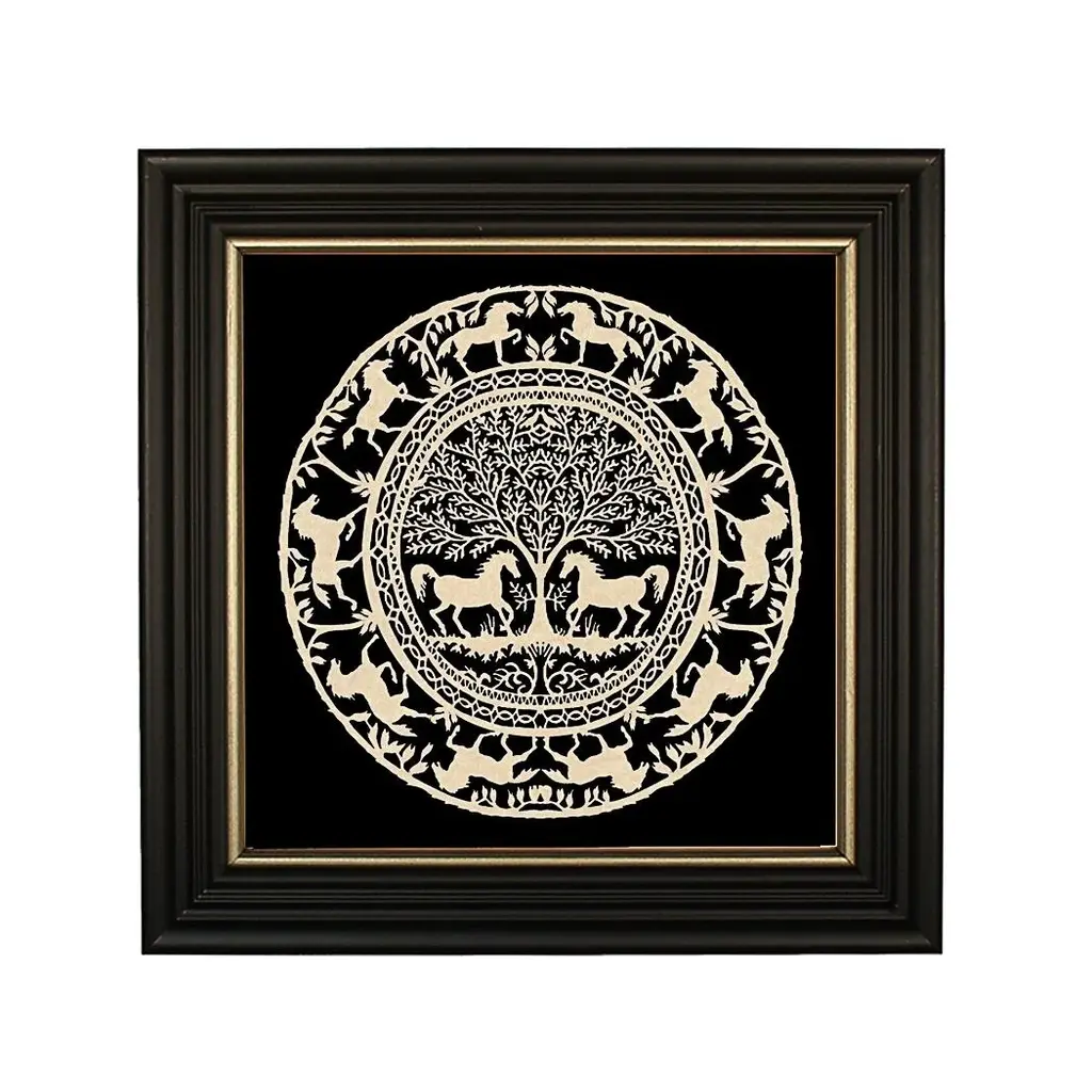 Equestrians and horse lovers will appreciate this unique paper cut scherenchnitte framed wall art! Perfect for equestrian decor or as a gift for a horse lover! Lacy eighteenth-century cutwork were cut freehand with scissors from strong rag paper. Our antiqued paper is laser cut and placed on a black paper stock, then framed behind two layers of glass for added depth. Framed in a 10" x 10" black wood frame with gold edge. The back is covered in craft paper and finished with a saw tooth hanger. The perfect addition to historical, western or equestrian decor. Quality materials and hand craftsmanship....entirely from the USA! - Laser cut scherenschnitte - 10" x 10" black, durable, solid ash frame with gold trim - Black frame with gold edge, attached saw tooth picture hanger on back - Behind two layer of glass for added depth - Special aged paper gives an antique appearance - Historical, western, equestrian decor - Handmade in USA