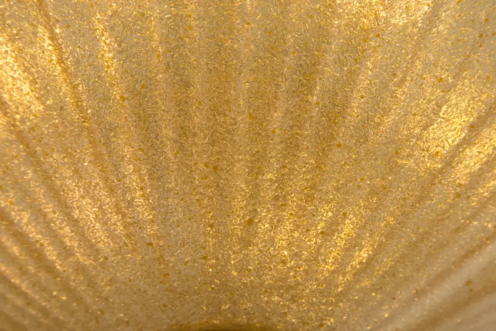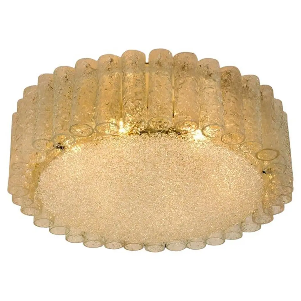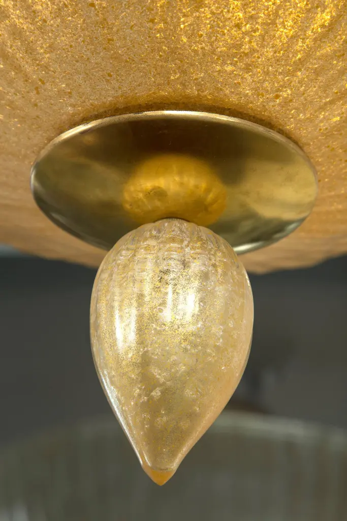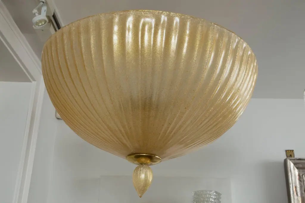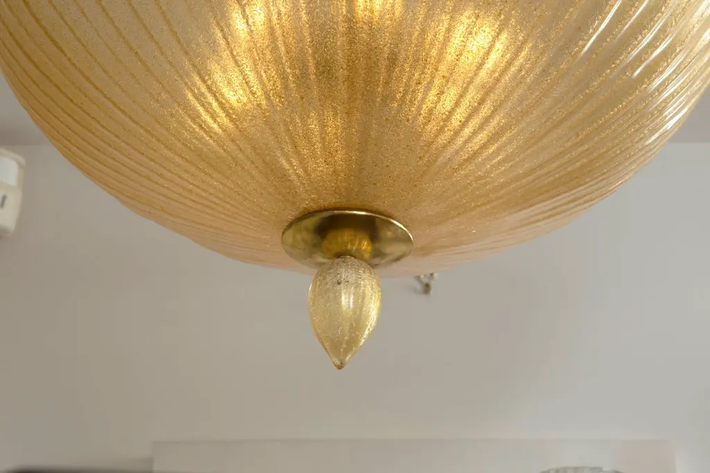 Blown in a soft gold toned color this lovely extra large dome shaped ceiling fixture with finial is illuminated with 5 medium base lights, non ULplease note weight of 36 lbsOrigin ItalyPeriod: newly blownGlass Dimensions of glass: 32” diameter, 20" high (recommended OAH 25")