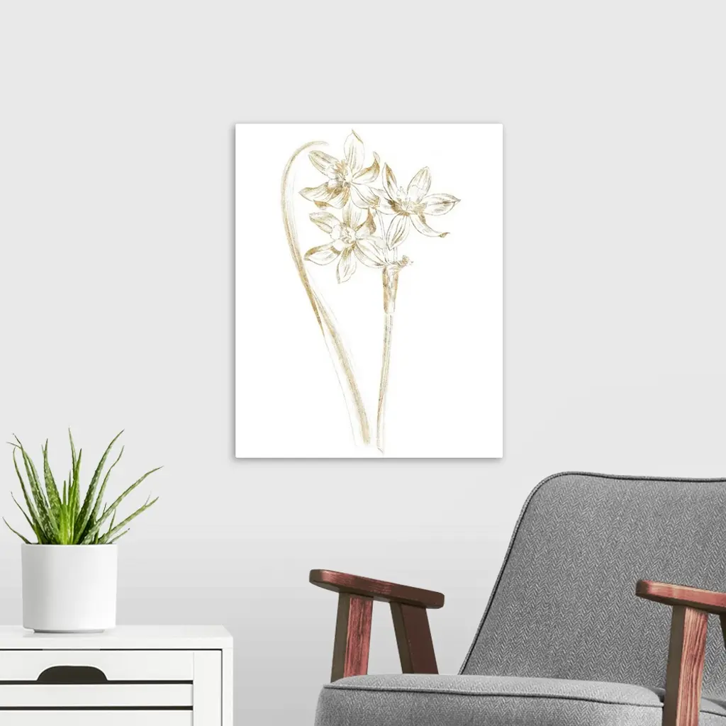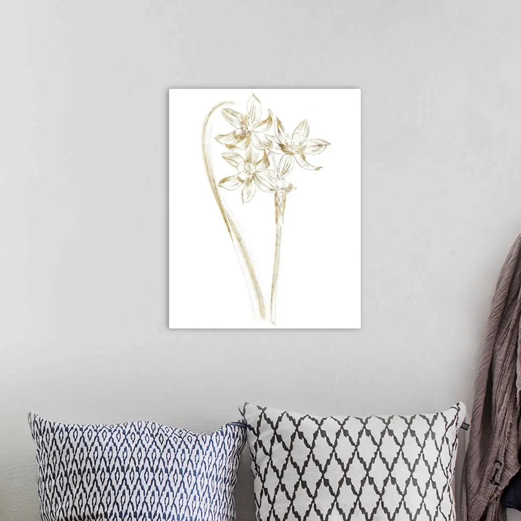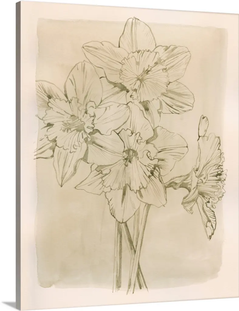 Gold illustration of daffodils on a solid white background.