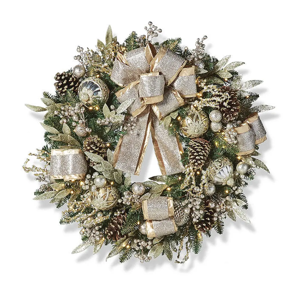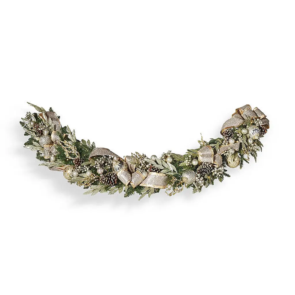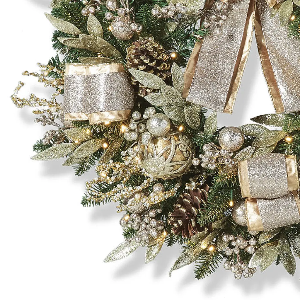 The festive sparkle of glittered picks, shimmering ribbon, gold ornaments and gilded pine cones is enhanced by warm white LED lights. Every element is arranged by hand for exceptional depth and dimension. A dazzling addition to any room, this cordless design is part of the Gilded Elegance Greenery Collection, which you can build on year after year. For indoor or covered outdoor use Plastic, shatterproof ornaments, polyester ribbon and natural pine cones Handcrafted Warm white LED lights Wreath has 100 lights 6 ft. Garland has 100 lights Use the built-in timer option to automatically turn the lights on for eight hours and off for 16 hours Requires three "D" batteries (not included) Fluff and shape greenery after unpacking To maximize the life of your greenery, we recommend a limit of 3 months of outdoor exposure per year Wipe clean with a soft, dry cloth or duster Imported Part of the Gilded Elegance Greenery Collection Coordinates with the Gilded Radiance Indoor Greenery Collection A Frontgate exclusive. At Frontgate, our primary focus is quality. We guarantee that every product we sell will stand up to the supreme test – our customers' satisfaction. To learn more about our policies, visit our Shipping & Processing, Returns & Exchanges and Warranty & Price Guarantee pages.