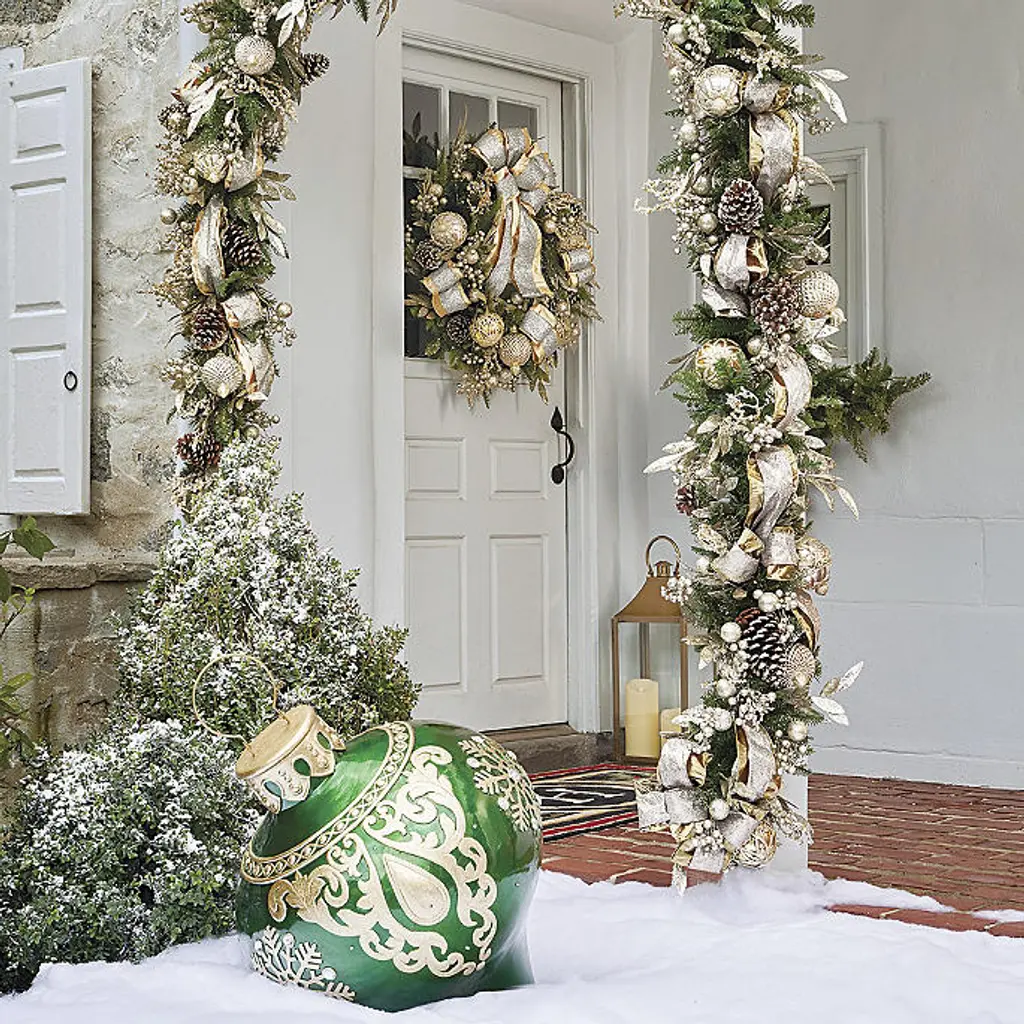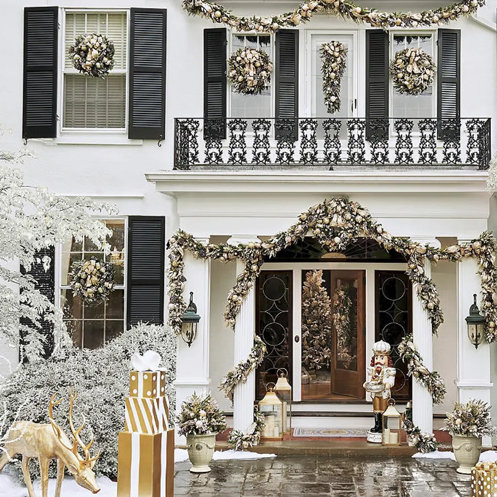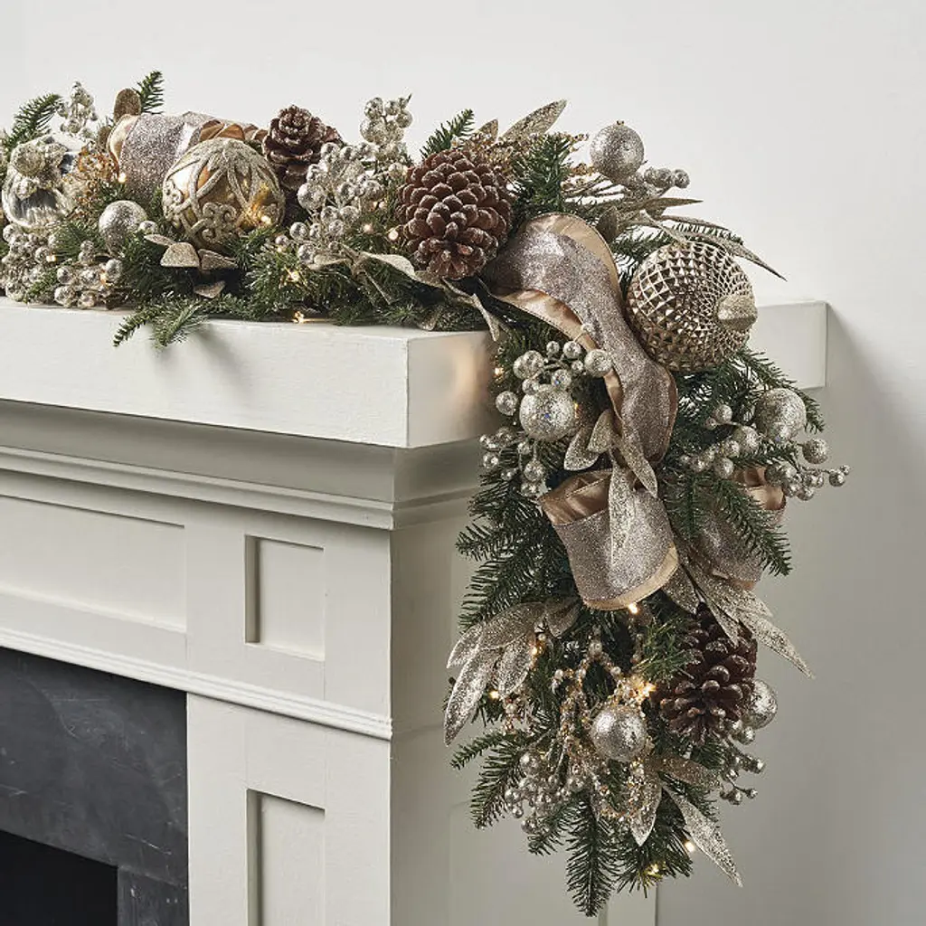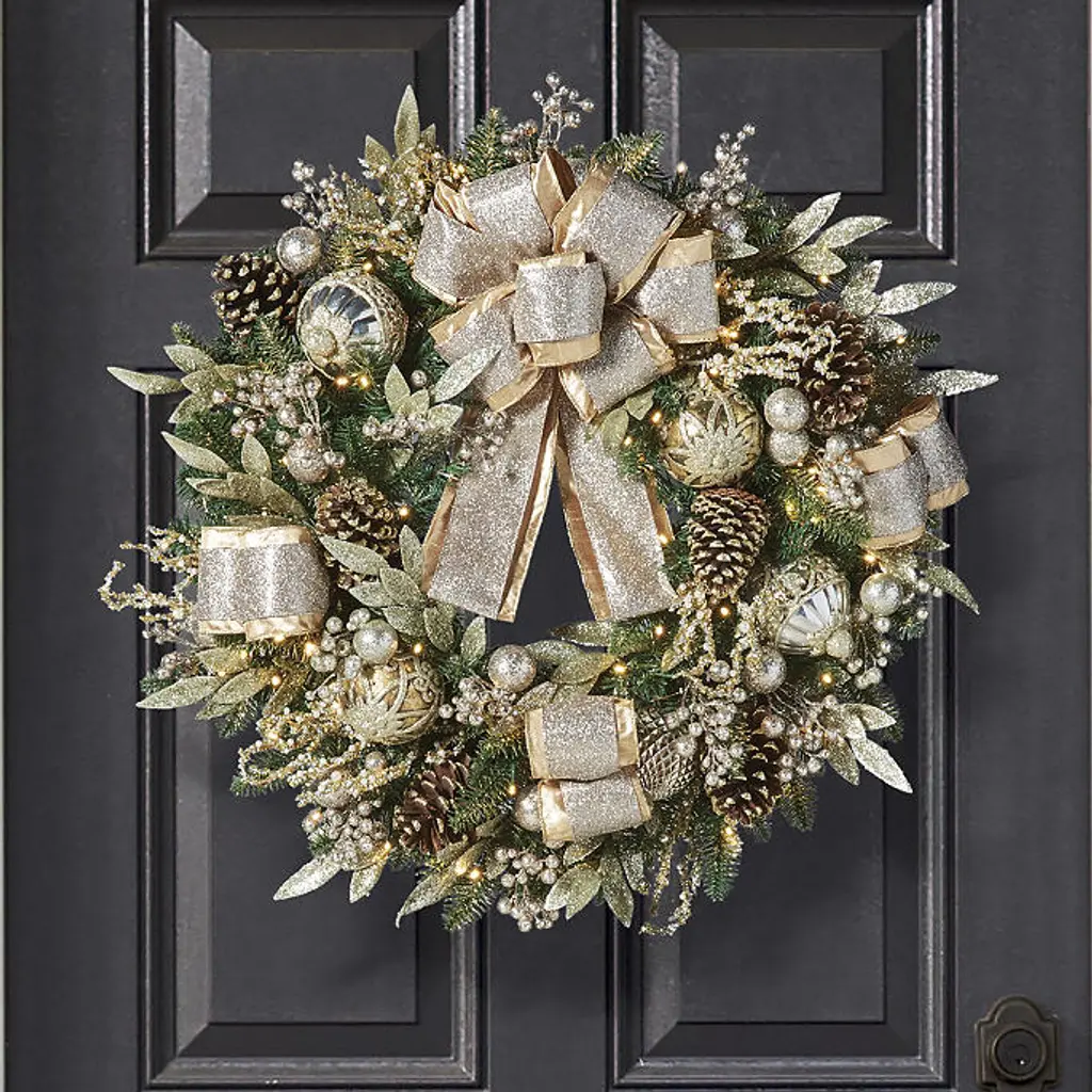 The festive sparkle of glittered picks, shimmering ribbon, gold ornaments and gilded pine cones is enhanced by warm white LED lights. Every element is arranged by hand for exceptional depth and dimension. A dazzling addition to any room, this cordless design is part of the Gilded Elegance Greenery Collection, which you can build on year after year. For indoor or covered outdoor use Plastic, shatterproof ornaments, polyester ribbon and natural pine cones Handcrafted Warm white LED lights Wreath has 100 lights 6 ft. Garland has 100 lights Use the built-in timer option to automatically turn the lights on for eight hours and off for 16 hours Requires three "D" batteries (not included) Fluff and shape greenery after unpacking To maximize the life of your greenery, we recommend a limit of 3 months of outdoor exposure per year Wipe clean with a soft, dry cloth or duster Imported Part of the Gilded Elegance Greenery Collection Coordinates with the Gilded Radiance Indoor Greenery Collection A Frontgate exclusive. At Frontgate, our primary focus is quality. We guarantee that every product we sell will stand up to the supreme test – our customers' satisfaction. To learn more about our policies, visit our Shipping & Processing, Returns & Exchanges and Warranty & Price Guarantee pages.