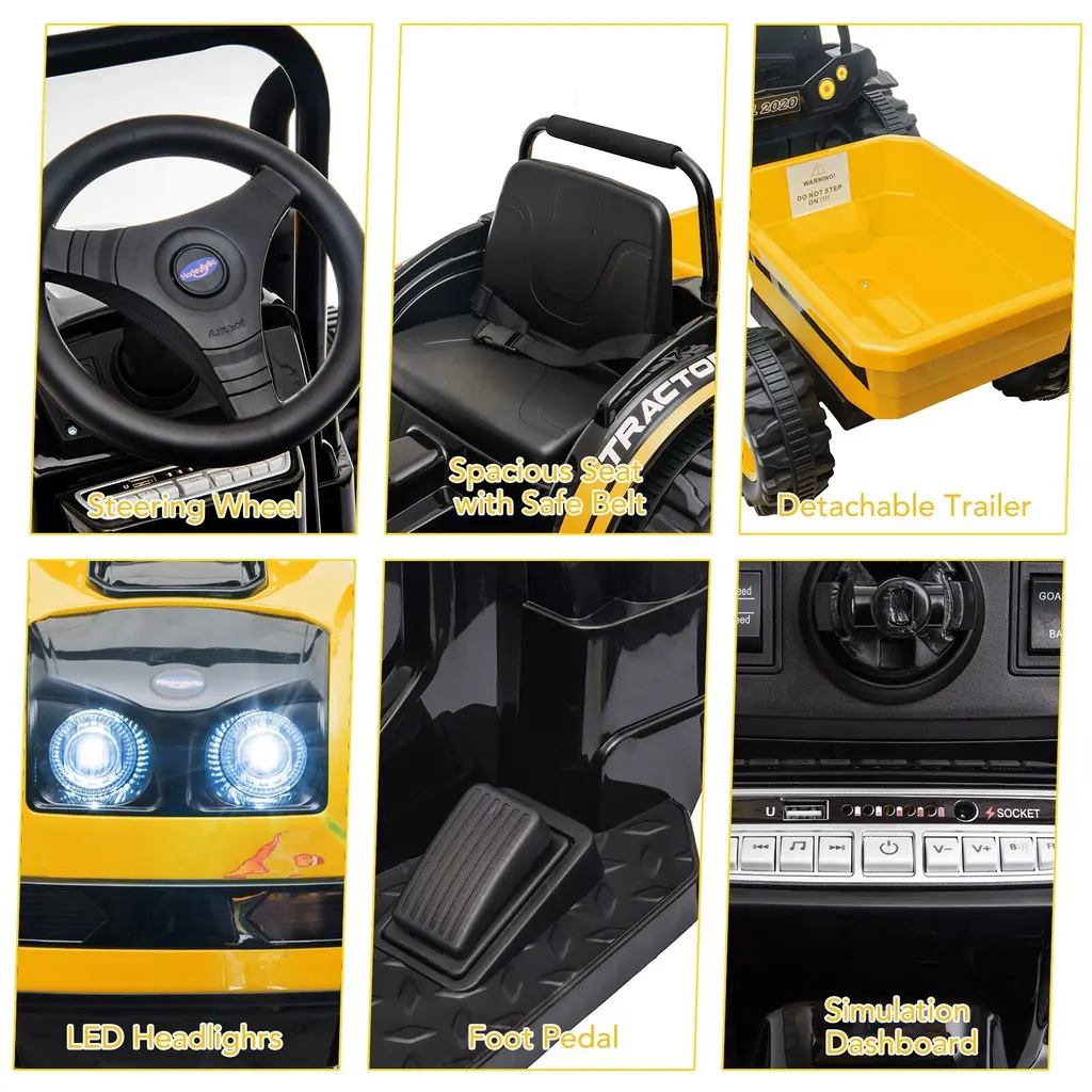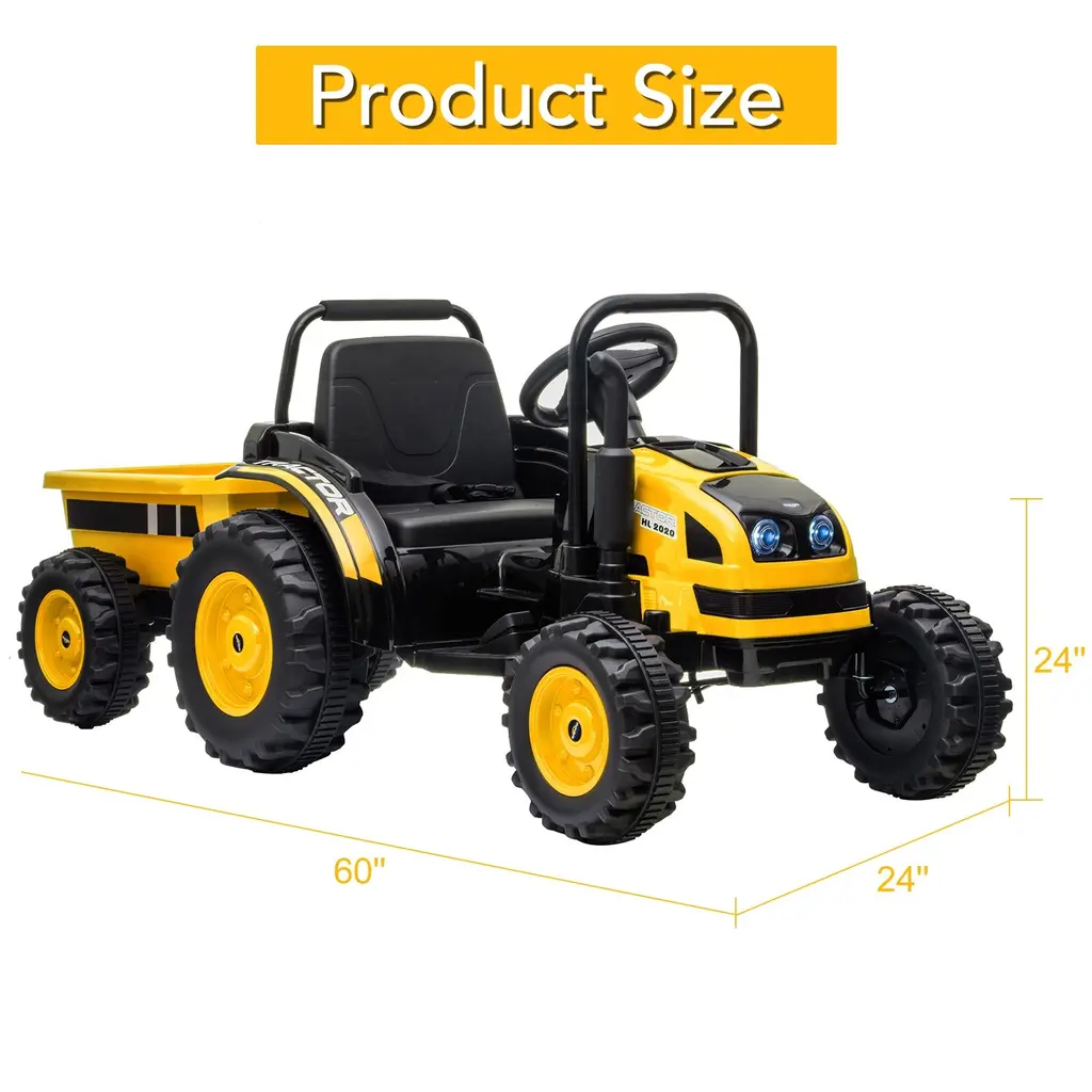 Immersive Sound Experience: The tractor is equipped with MP3 compatibility and multi-functional music effects, allowing children to enjoy a dynamic and engaging auditory experience during their playtime adventures. The integration of music adds an interactive element to the driving experience, enhancing the overall enjoyment and creating a more immersive play atmosphere.Versatile Trailer Inclusion: Our tractor comes complete with a trailer, offering children the opportunity to expand their imaginative play and engage in transporting items during their adventures. This versatile addition extends the play possibilities, allowing children to create and experience a wide range of imaginative scenarios during their playtime.Cutting-Edge 2.4G Remote Control: Our ride-on tractor is thoughtfully designed with an advanced 2.4G remote control system, ensuring precise and convenient navigation. This feature provides parents with the ability to guide and supervise their child's playtime, offering added peace of mind while maintaining a safe and enjoyable experience for young drivers.Enhanced Stability with Rear Wheel Suspension: Our tractor is built with rear wheels featuring suspension, providing a smooth and stable driving experience. This feature is especially beneficial on uneven or rough terrain, ensuring that young drivers can enjoy a comfortable and secure ride, enhancing their overall playtime experience.Vibrant LED Lights: The tractor features eye-catching LED lights, illuminating the play space and enhancing the authenticity of the driving experience. These vibrant lights not only add to the excitement of playtime but also improve visibility, especially during outdoor adventures, contributing to a safer and more enjoyable driving experience for children.