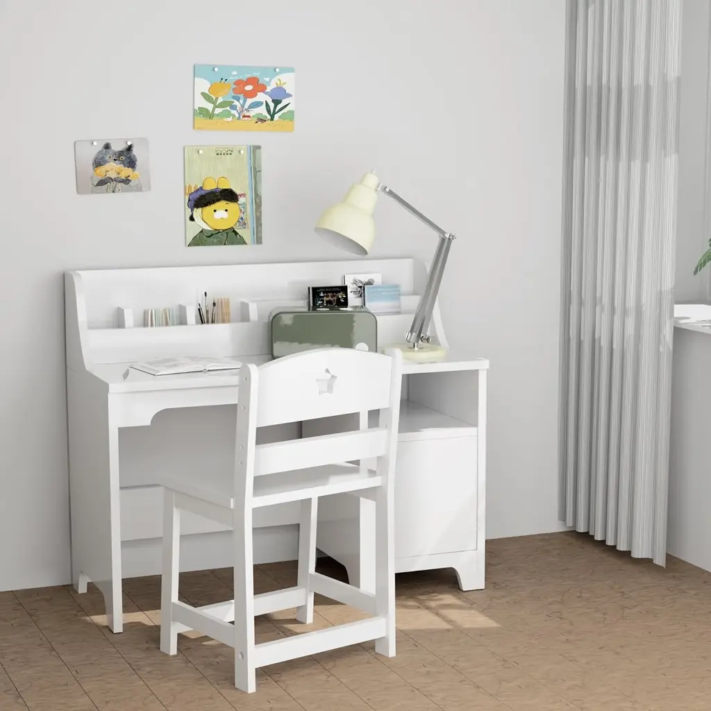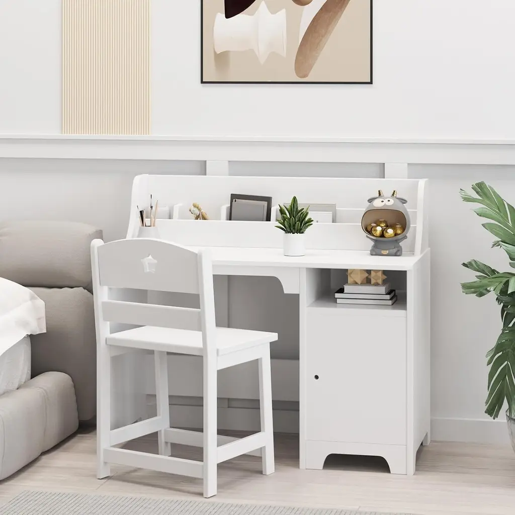 【Sturdy & Safe Materials】: Crafted from good quality, eco-friendly engineered wood with a safe, scratch-resistant paint finish, this kids' desk and chair set ensures durability and stability, providing a reliable study space for your child【Ample Storage Solutions】: Featuring a tabletop stand-up organizer to help hold kids’ books,pencil and other school supplies, a storage cabinet with door and an additional open storage , this study desk offers multiple storage options for books, supplies, and personal items, keeping everything organized and within reach.【Ergonomic Comfort】: Designed with children's comfort and posture in mind, the ergonomic chair supports spine and joint health, while the desk's dimensions cater specifically to kids ages 3-8, making studying more comfortable and enjoyable.【Ideal Kids' Gift】: With its simple yet beautiful design, this wooden study table and chair set is a perfect match for any room decor, making it an excellent gift for birthdays or holidays, encouraging organization and productivity from a young age.【Easy Assembly & Maintenance】: This desk and chair set is not only easy to assemble with the included manual but also simple to clean with a damp cloth, ensuring more time is spent on learning and playing rather than on setup.