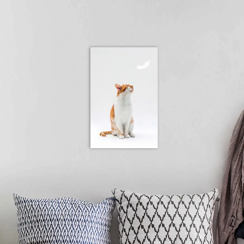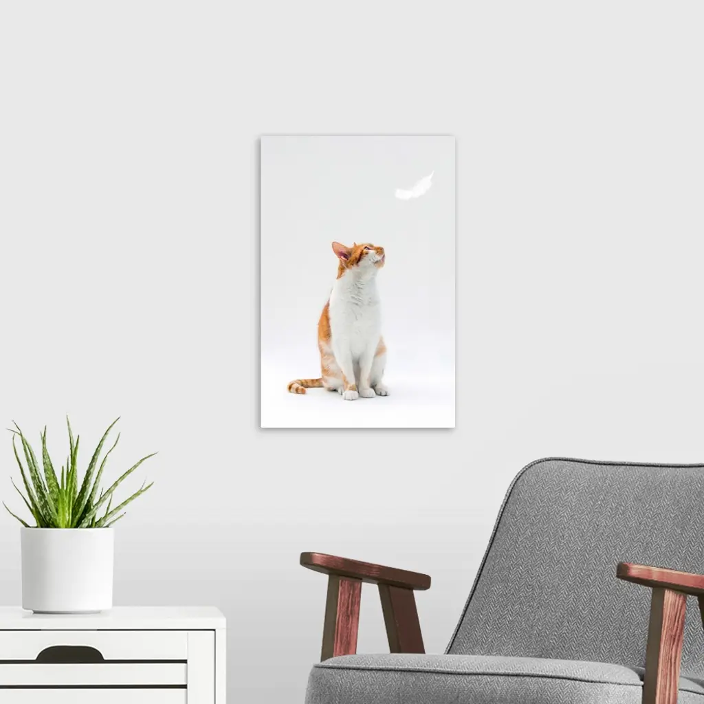 Ginger and white cat looking up towards falling white feather. wall art for home and office decor. Discover canvas art prints, photos, mural, big canvas art and framed wall art in GreatBigCanvas.com's varied collections.