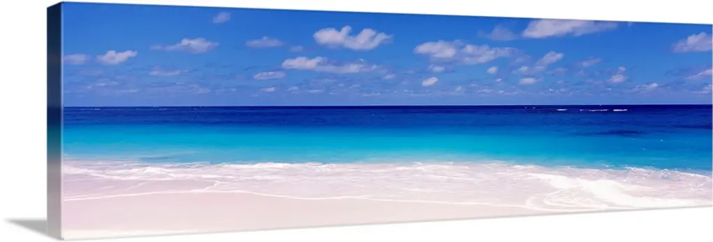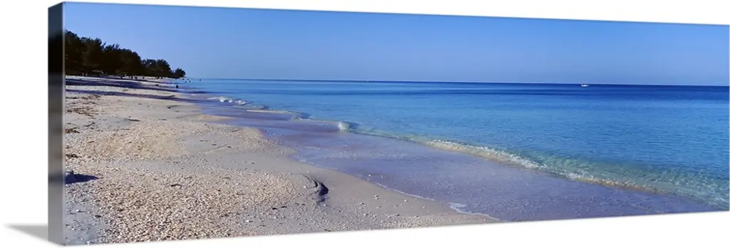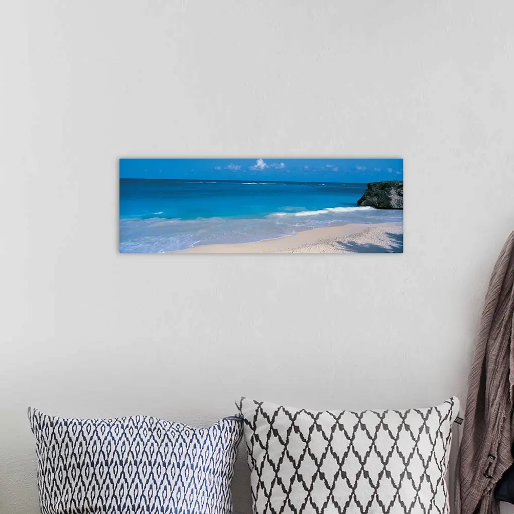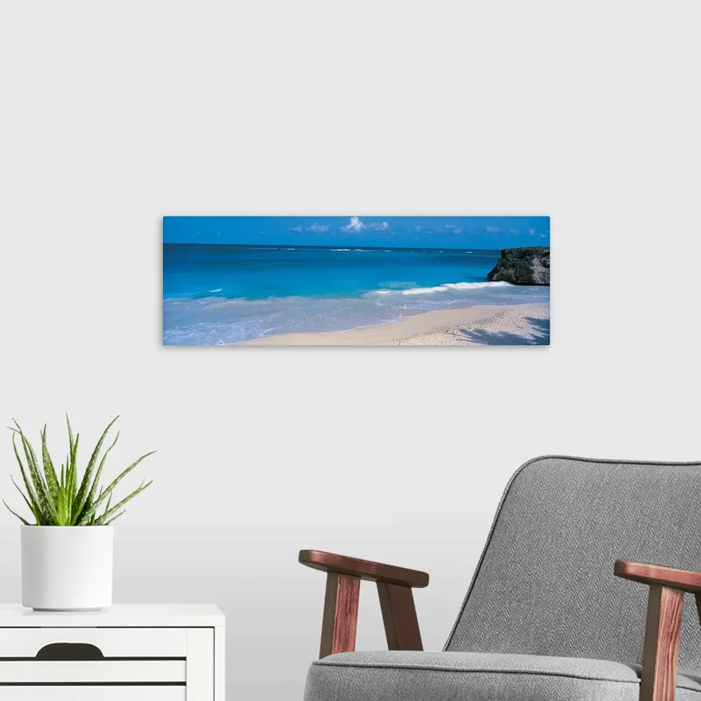 This is a panoramic photograph of small waves breaking on a sandy tropical beach.