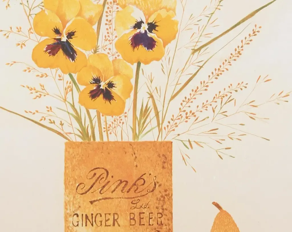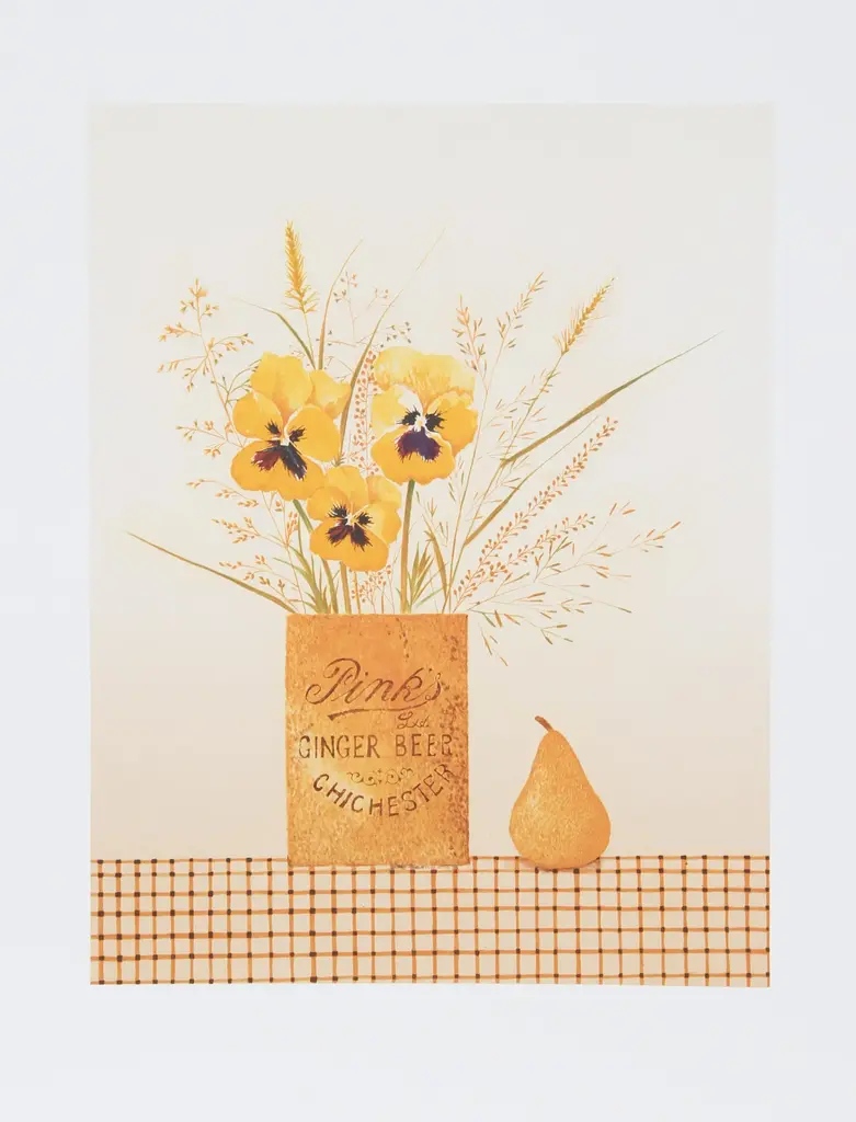Resting on a checkered table, the flower arrangement and pear in Mary Faulconer's print is filled with life and rendered with simplicity. Focusing on the small details of the subjects but simplifying the surrounding background, the artist's depiction of pansies is sweet and chic. Ginger Beer Mary Faulconer American (1912–2011) Date: circa 1980 Lithograph, signed and numbered in pencil Edition of 250, AP 35 Image Size: 17 x 13 inches Size: 30 in. x 22 in. (76.2 cm x 55.88 cm)