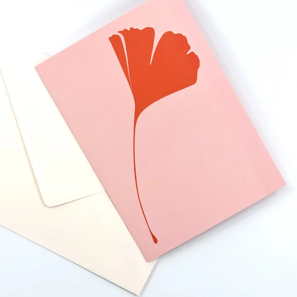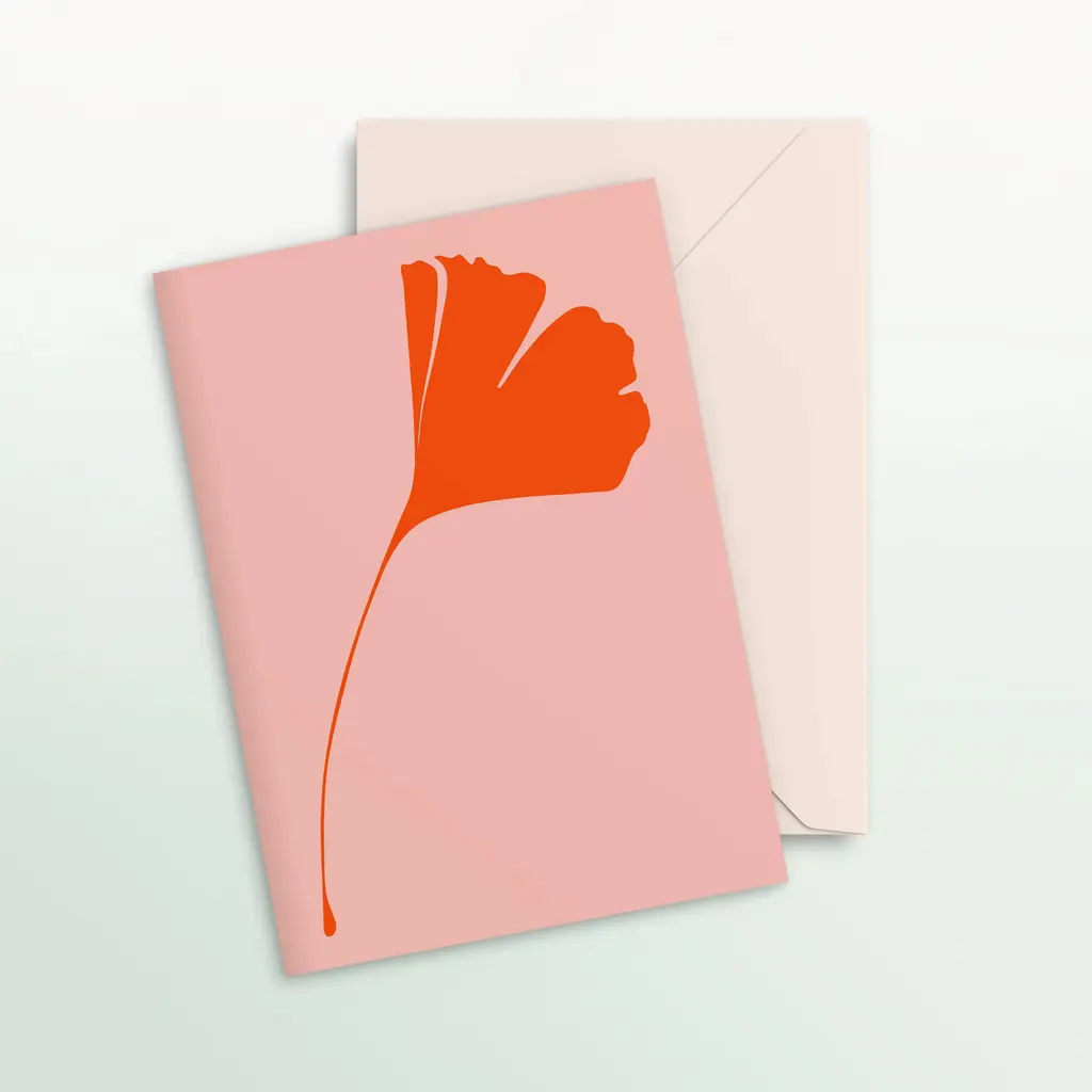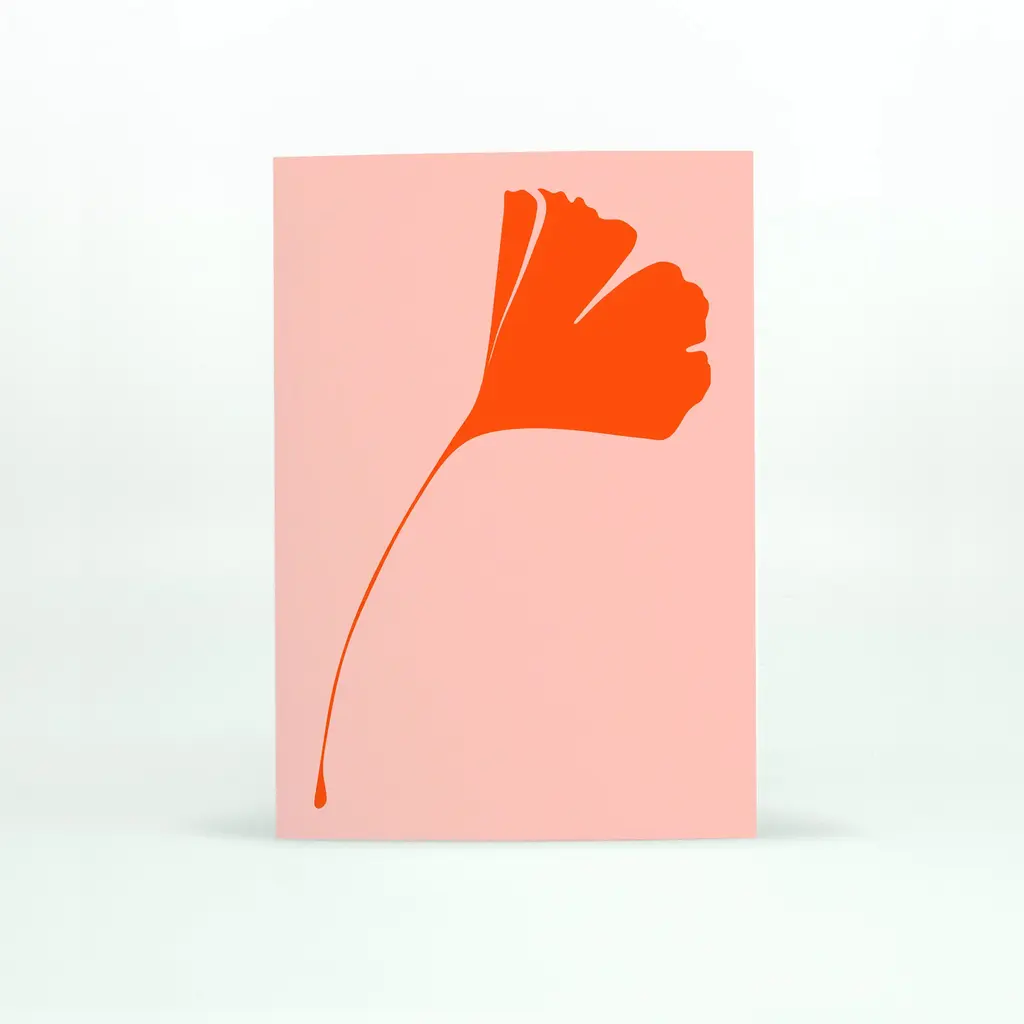 The Ginkgo tree, often regarded as a symbol of hope, is famous for its health benefits, particularly for the heart and brain. The design of this greeting card is inspired by the distinct fan shape of a slowly opening Ginkgo leaf. Its striking red silhouette is beautifully contrasted against a pale pink background. The card remains blank on the inside, making it a versatile choice suitable for any occasion that calls for a gift.