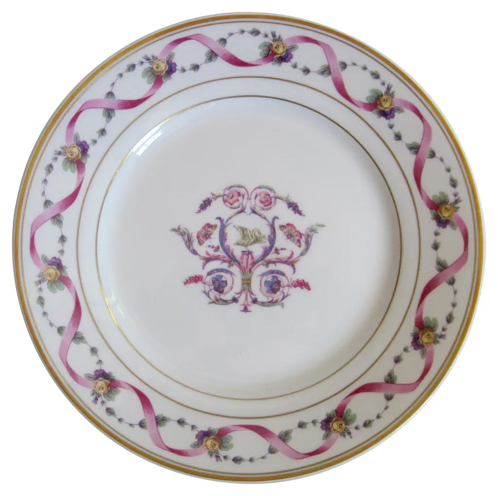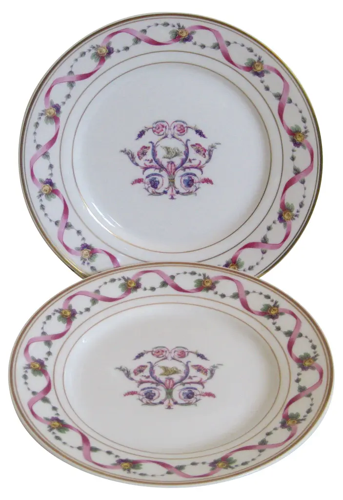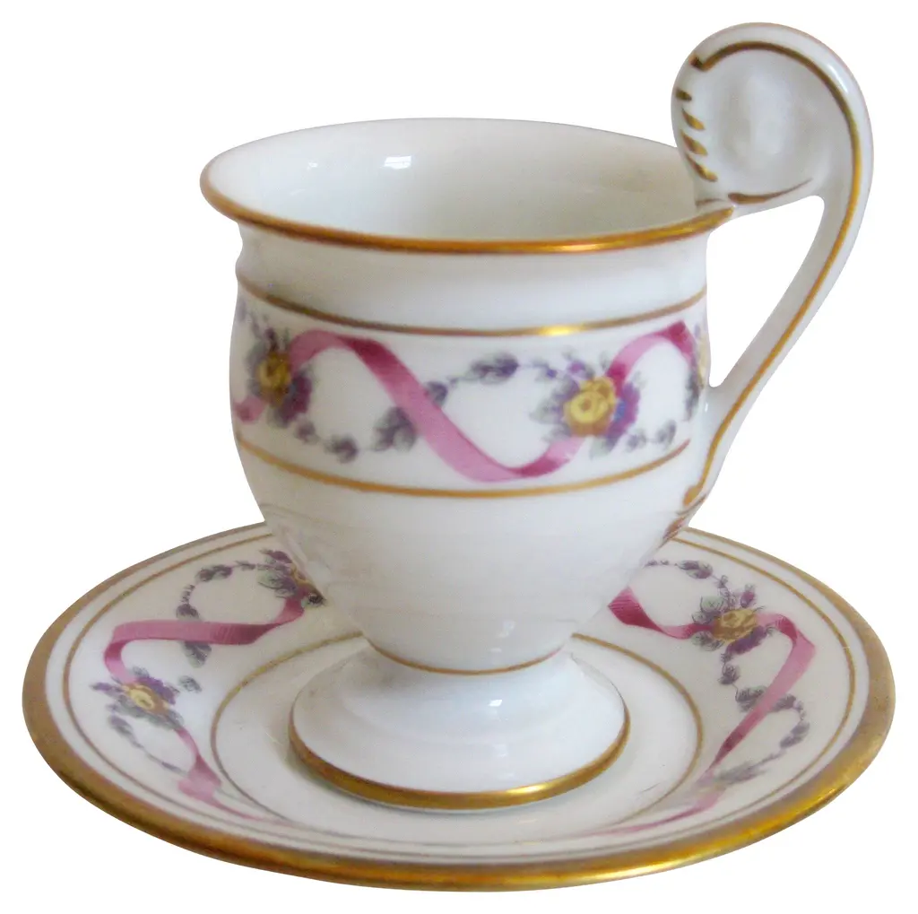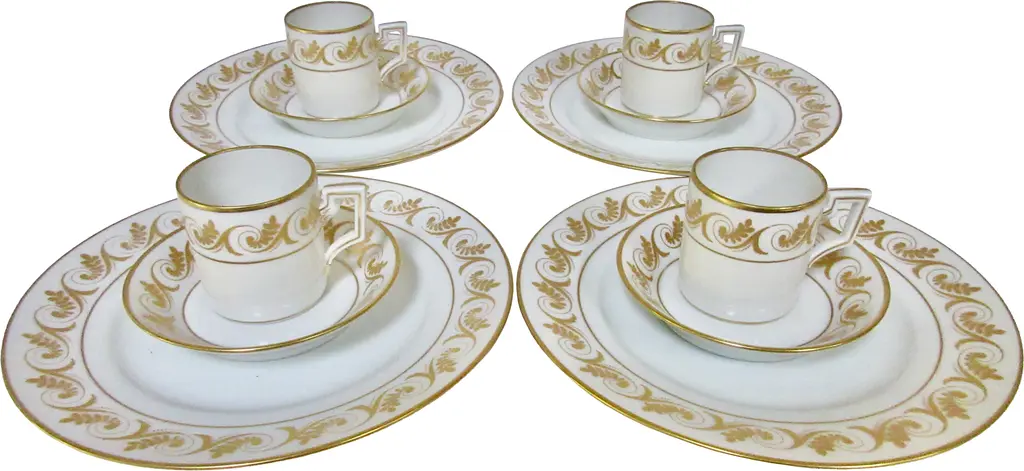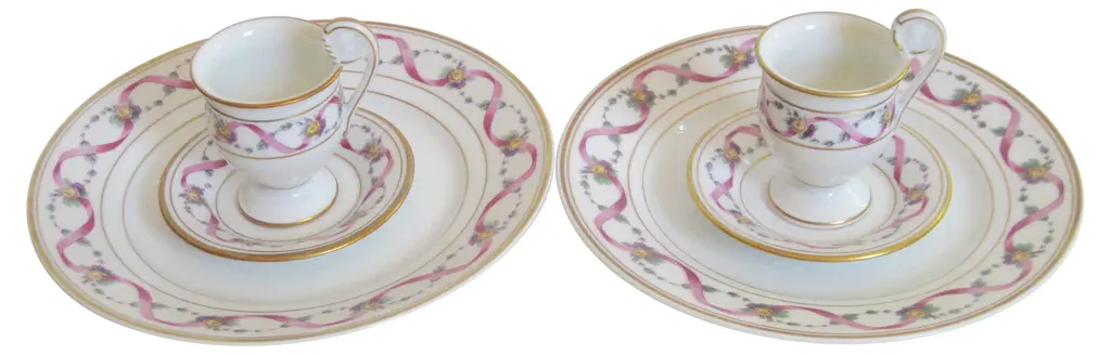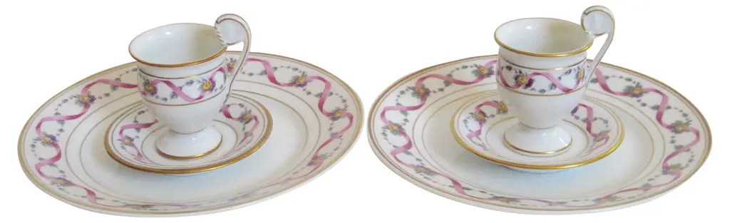 Italian Richard Ginori gilt porcelain dessert plates, espresso cups and saucers in the coveted Rapallo pattern. Service for two. Ribbons with posies, a single bird and fanciful scrollwork decorate these exquisite pieces of Italian porcelain. Details include elaborate cup handles and an African violet in the center of each saucer. Marked "Richard Ginori Italy." Plates: 7.5"D, 1"H; cups: 2.12"D, 2.5"H; saucers: 3.87"D, 0.75"H.
