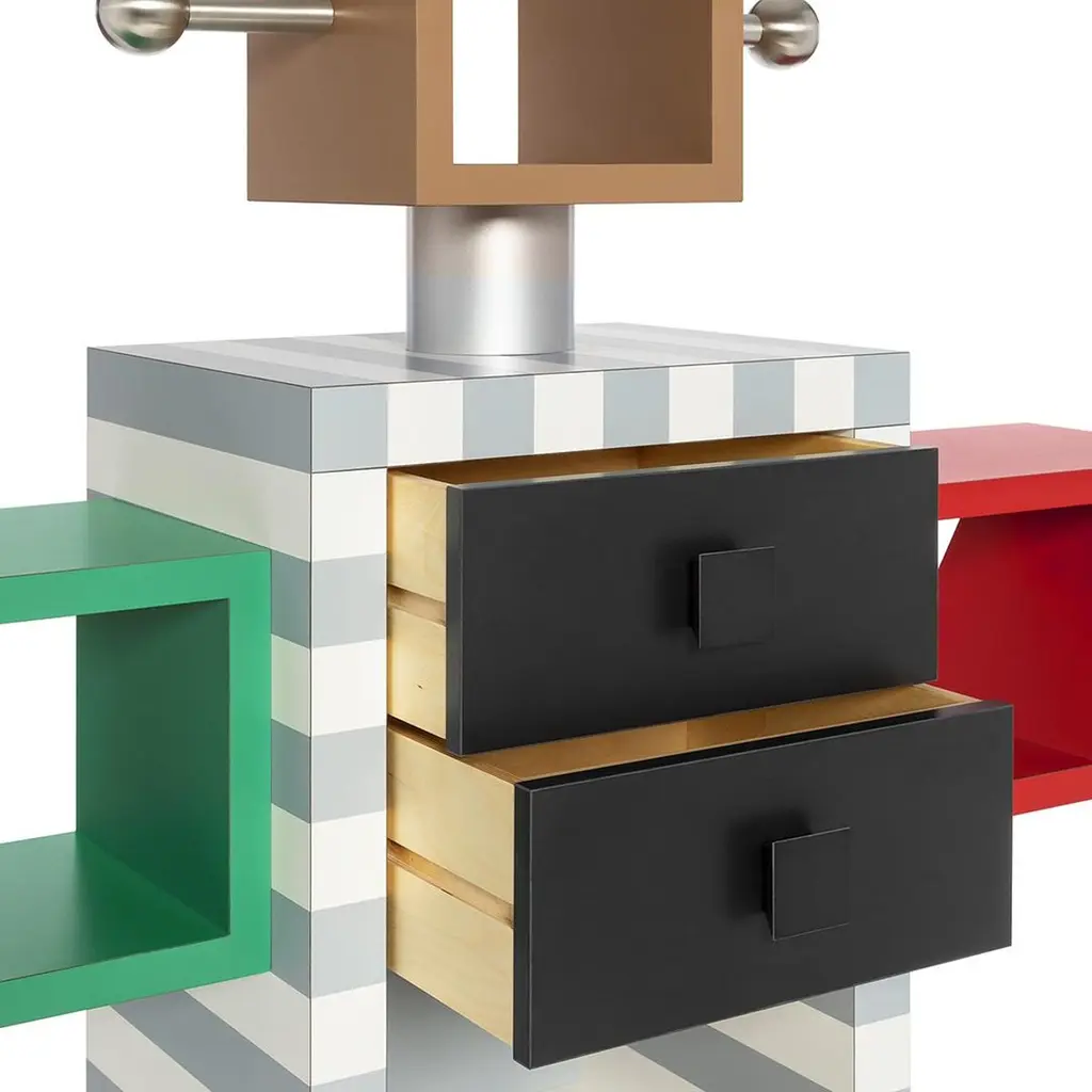 Ginza wooden robot with plastic laminate, shelves & drawers by Masanori Umeda for Memphis Milano collectionAdditional information:Wooden robot with plastic laminate, shelves and drawers.Collection: Memphis MilanoDesigner: Masanori UmedaYear: 1982Dimensions: W 150, D 42, H 175 cmThe product is purchased with authenticity certificate and guarantee stamp.Pricing: price does not include VATMasanori Umeda was born in Kanagawa – Tokyo in 1941. He obtained a diploma at Tokyo’s Kuwasawa Design School in 1962. He moved to Milan in 1967, where he worked for Achille and Pier Giacomo Castiglioni. In 1981 Umeda designed his most famous work for Memphis: the Tawaraya boxing Ring, where all the founders designers are shown together in one of the most iconic images of Memphis Group. He returned to Japan in 1986, where opened his studio and continued to design postmodern, poetic and ironic furnitures. His works are exhibited in many museums throughout the world.Memphis is the great cultural phenomenon of the 1980s that revolutionized creative and commercial logics in design. Born from the idea of Ettore Sottsass and a group of young designers and architects, in Milan, coupled in the years by famous designers from the international scene, Memphis turned upside down all of the existing parameters on living. Ettore Sottsass as the backbone of the group, design gained a new concept and expression through new shapes, materials and patterns, expanding the creative limits of the industry. Memphis became a symbol of New Design. Its influence is still clear in various sectors of production and beyond.