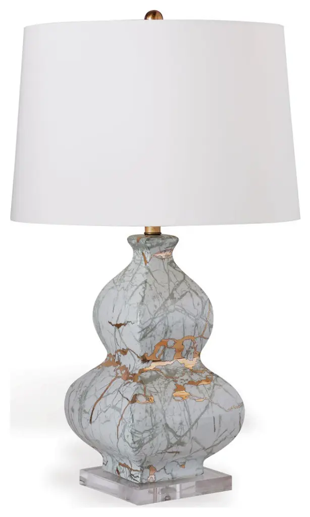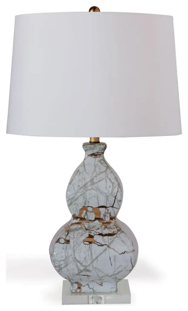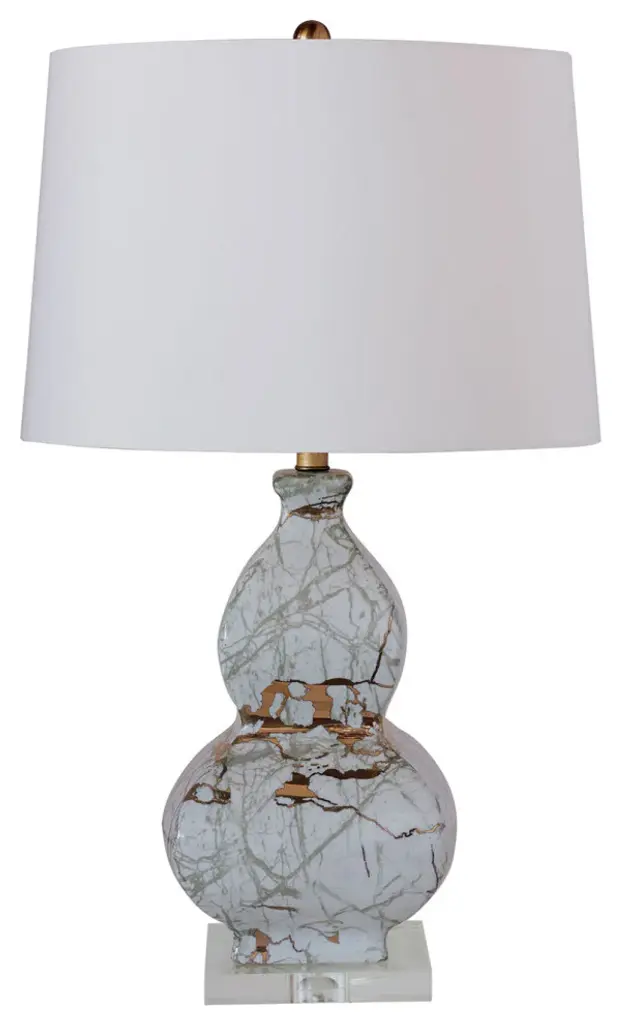 Inspired by the beauty of natural marble, our Giovanni collection embraces the movement of the marble pattern with accents of reflective gold. Each porcelain piece is a designers dramatic accent for the room.The marble pattern is a sage green/gray color with gold highlights on a white/cream background. Aged brass finished ball finial. Lucite square base.3 way switch. 100 watt bulb max.Shade: Round drum hardback shade with soft rolled edge. Ivory polyester fabric. Brass spider. Shade measures: 16" x 18" x 12"SHBulb Type: StandardNumber of Bulbs: 1Bulbs Included: None UL Listsed: YesBulb Wattage: 100Hardwire or Plug: Plug