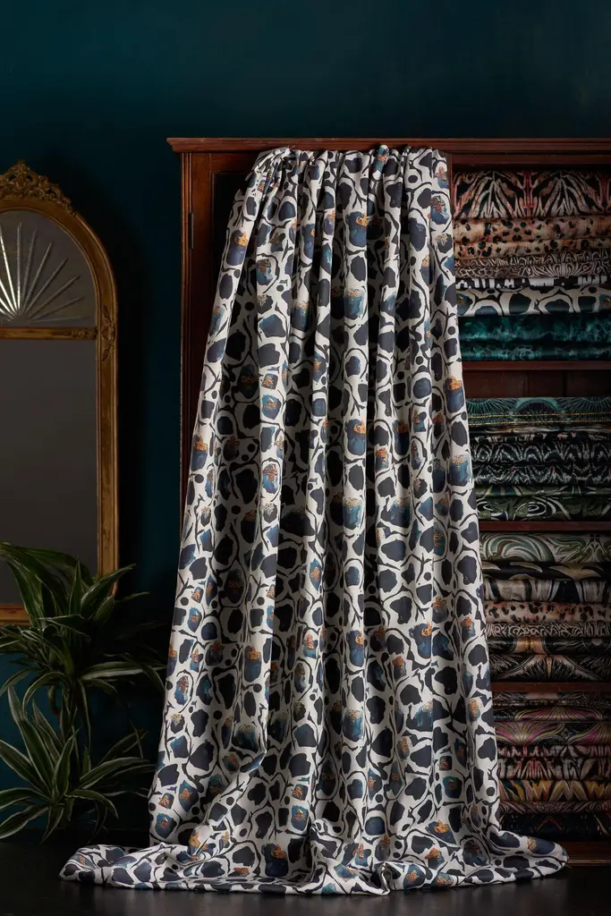 Our animal inspired ink print, hand painted by Anna. This design has beautiful petrol and grey tones on an off-white base. With gold accents this is a luxurious and opulent design which fits around many schemes.This velvet is midweight, with a strong straight woven backing, so is suitable for upholstery, but is also light enough for curtains and cushions.Measures: 140 cm widePattern repeat 25 cm wide and 35 cm high. 100% polyester.50’000 rub count.Dry clean only.Weight 345 grams per square metre. Please note our velvets are not naturally fire retardant. FR and CRIB 5 treatment available upon request. The cost for FR and CRIB 5 treatment is an additional £6/metre.Delivery time – This fabric is printed to order and dispatched directly from our print partner, within approximately 2 weeks. If you have a particular deadline do let us know. Fabric is shipped on rolls. Samples are available on request for a cost of £2.00. Samples are approximately A5 size and are available for immediate dispatch.