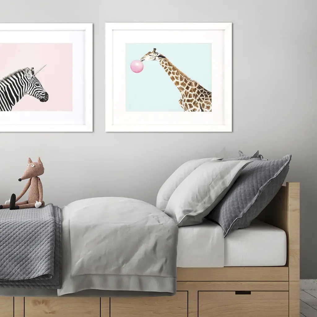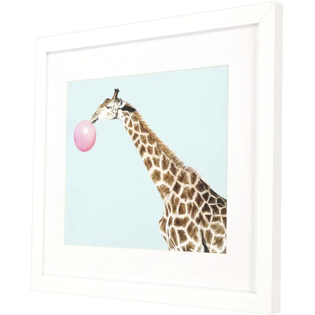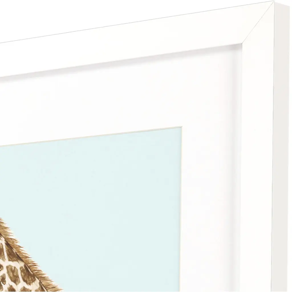 A colorful zebra youth image that is matted, framed under glass and paired with a matte white frame.
