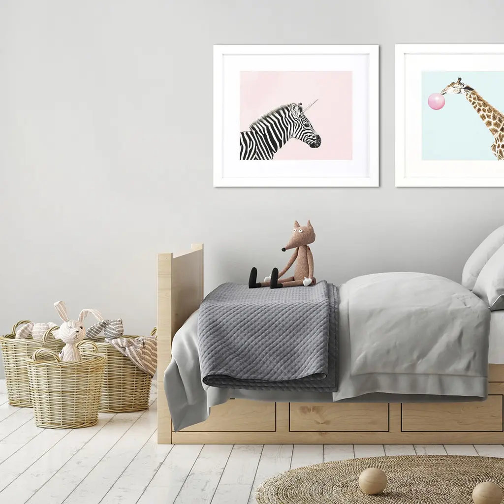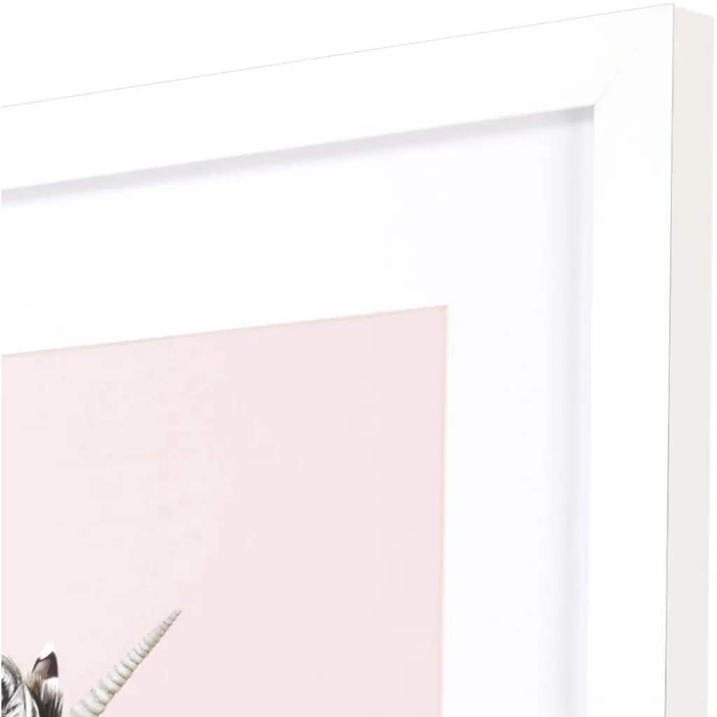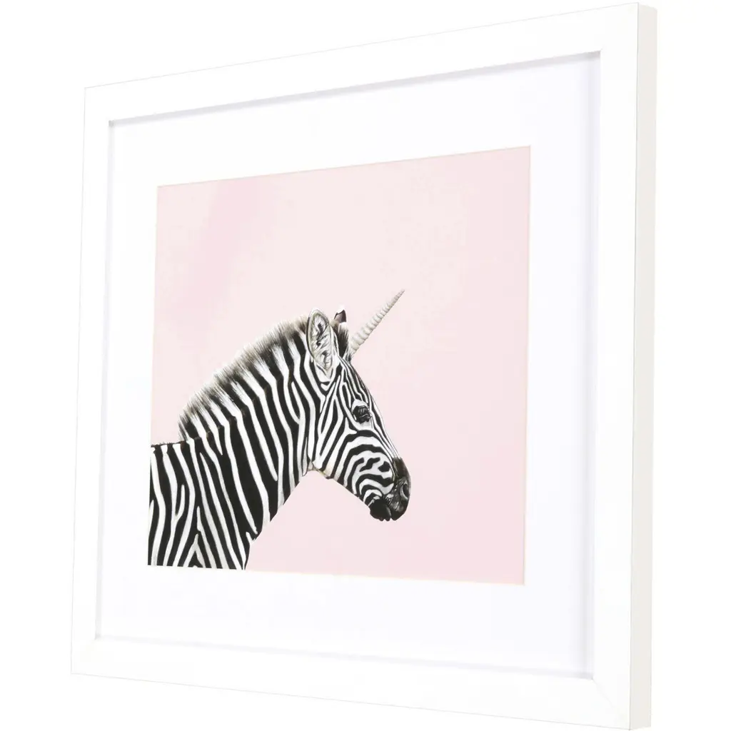 A colorful zebra youth image that is matted, framed under glass and paired with a matte white frame.