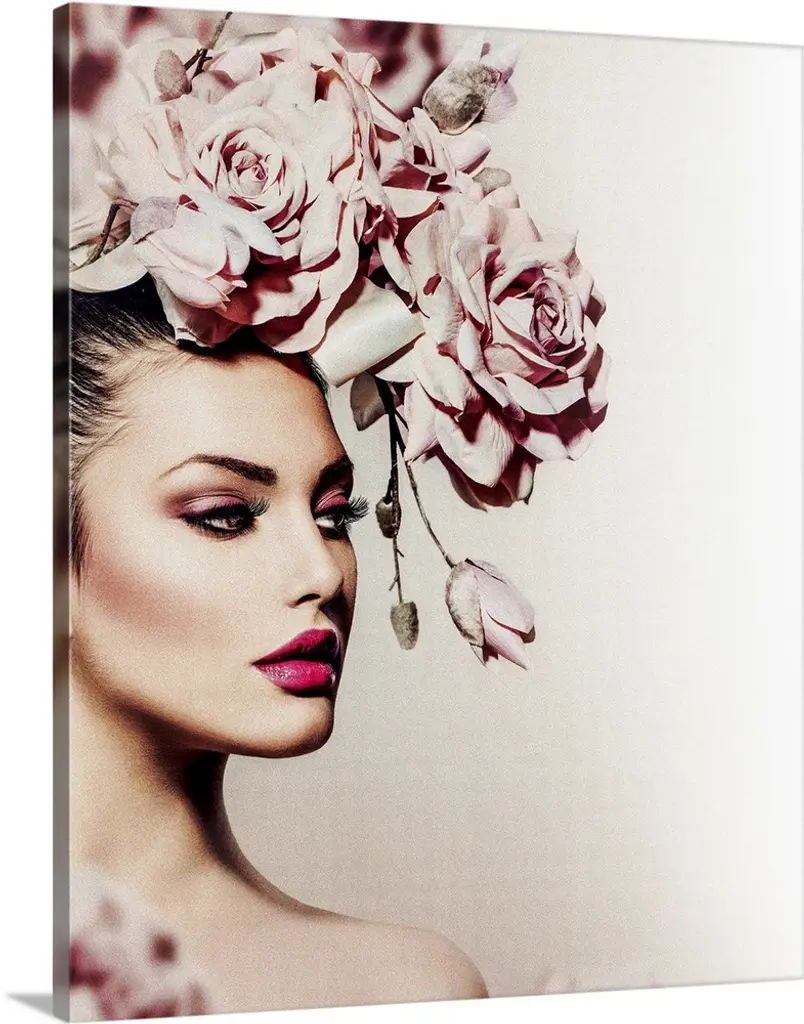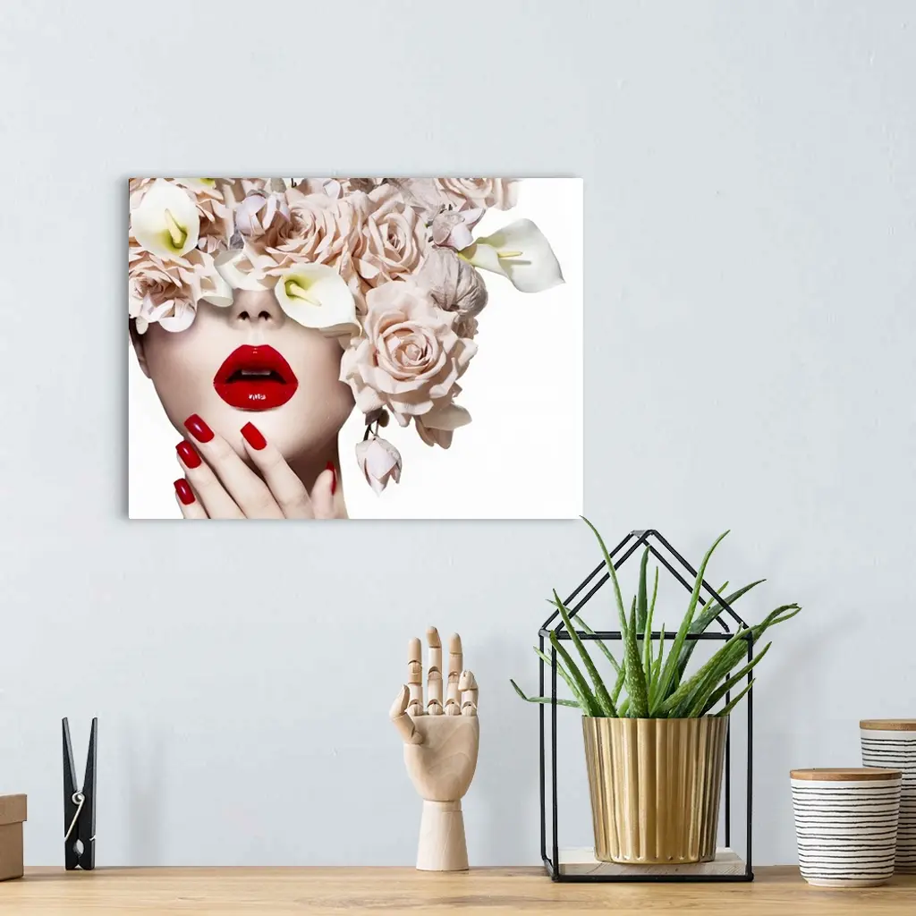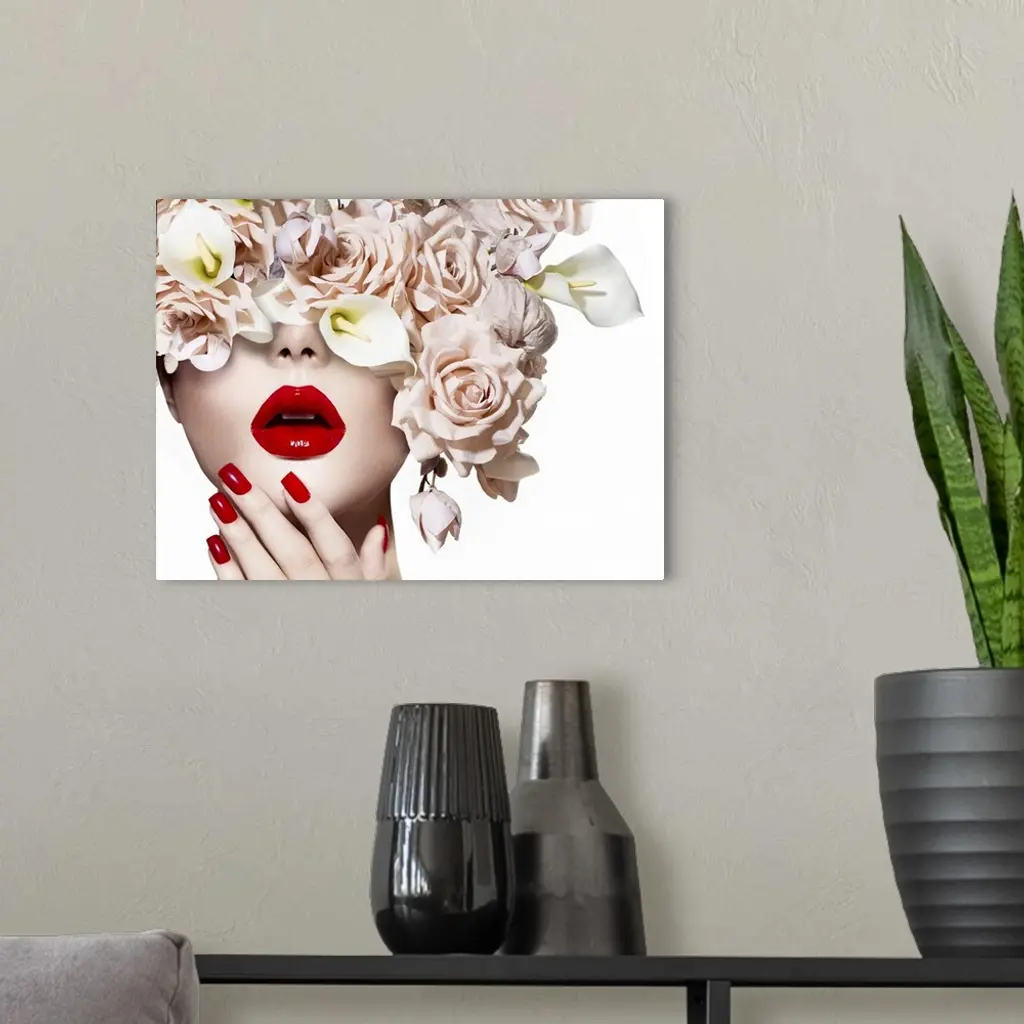Vogue style model girl face with roses. Red sexy lips and nails.