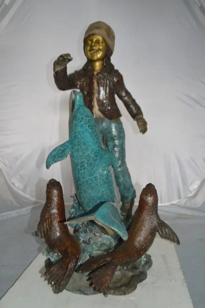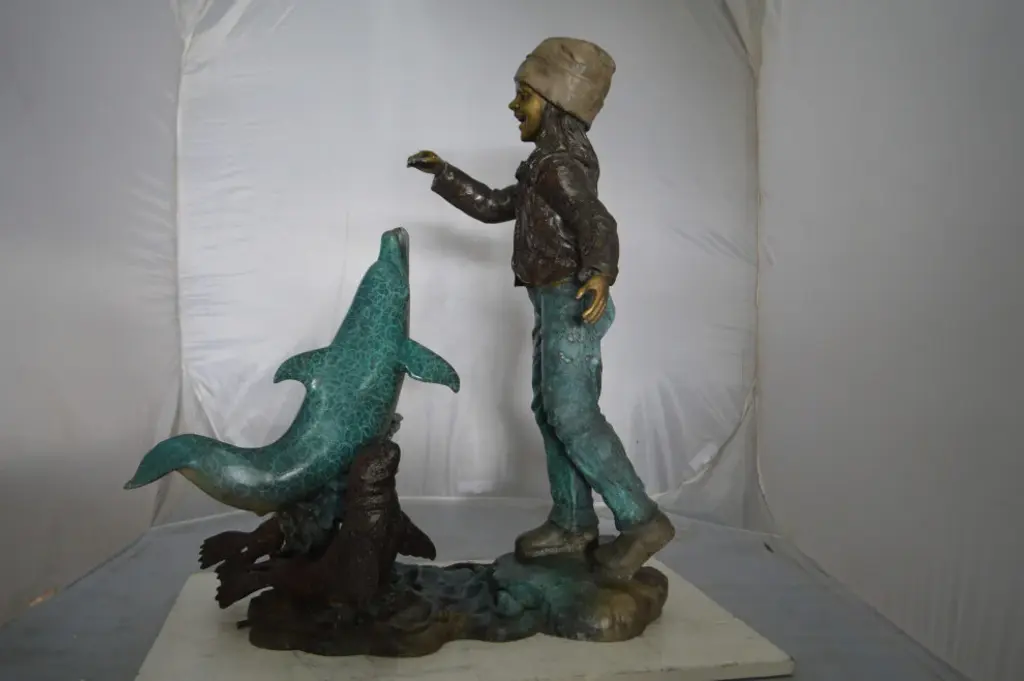 This large bronze statue, fountain, reminds one of a scene from an aquarium. A young girl is feeding a dolphin as two seals surround the creature. She clearly has a special affinity for the animal, as evidenced by her gaze and smile. The color comes from a patina over the bronze, cast in the Lost Wax method. The statue is equipped with a hoses that leads water out of the two seals mouth, with the use of a fountain pump (pump is not included). This is a special piece for any art or animal enthusiast. Size: 28"L x 17"W x 37"H. Weight is: 98Lb
