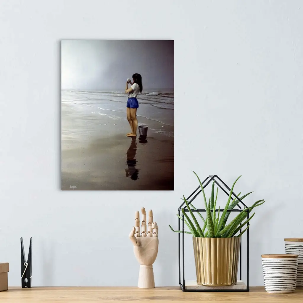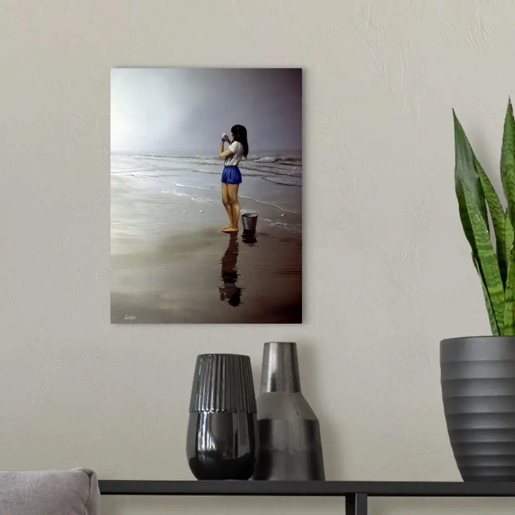 Contemporary painting of a young woman on the beach holding a seashell.