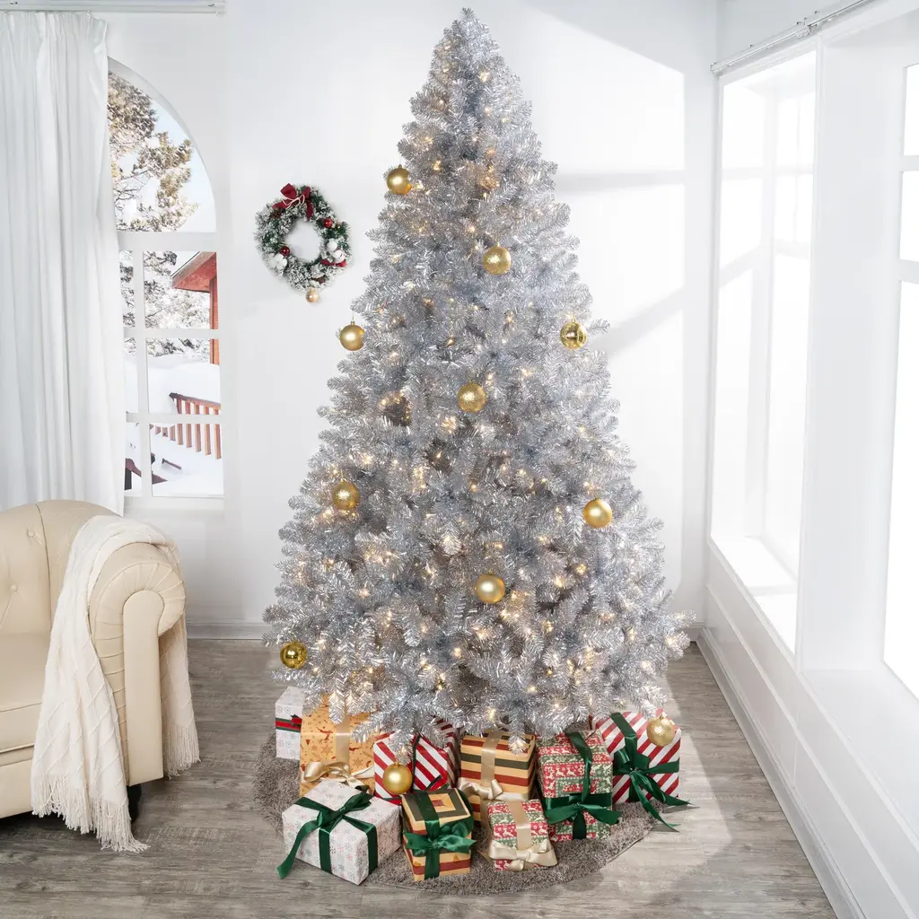 Discover the allure of our Naomi Home Giselle Diamond Christmas Tree, a mesmerizing masterpiece that will make your holiday season truly unforgettable. With its distinctive silver hue and one-of-a-kind design, this tree stands out as a captivating focal point in any room. Embrace the spirit of enchantment and create cherished memories with this extraordinary and elegant addition to your Christmas celebrations. • SILVER CHRISTMAS TREE : Discover the allure of our Naomi Home Giselle Diamond Christmas Tree, a mesmerizing masterpiece that will make your holiday season truly unforgettable. With its distinctive silver hue and one-of-a-kind design, this tree stands out as a captivating focal point in any room. Embrace the spirit of enchantment and create cherished memories with this extraordinary and elegant addition to your Christmas celebrations. • PRE-LIT WITH WARM LIGHTS : The fake Christmas Tree comes Pre-lit with 600 incandescent lights that make setting up your tree a breeze. These lights emit a warm glow that highlights your decorations and holiday gifts making your Silver Christmas Tree Prelit extra-special. • DENSER, REALISTIC & FULL : Our 7.5 feet Pre Lit Christmas Tree comes with 1412 branch tips, 600 warm lights, and has a girth of 53 inches, which are unmatched for a 7.5ft Christmas tree. With the Naomi Home Artificial Christmas Tree, you will get the most realistic & full Christmas Tree that you can get. You can also checkout other sizes: ( 6.5ft - 978 Branch Tips, 450 Lights, 47" Girth ) • LASTS LONGER THAN THE COMPETITION : While the Festive season lasts just for a couple of months, our Naomi Home Lighted Christmas Tree can last longer. Made with high quality new PE, PVC and a sturdy Metal Stand, you can be assured to store your tree without hassle for a long time. The materials are also flame retardant and non-allergenic. • EASY TO ASSEMBLE : Our Silver Christmas Tree with Lights features hinged branches, making assembly and disassembly very convenient. The Branches fall easily in place for fluffing and are easy to fold back up for storage. Our Proprietary Packaging ensures the safe delivery of the Silver Tree to your home. The christmas tree comes with 90 days Manufacturer's warranty and in case of any issues, you can contact our customer support for easy refunds/replacements.