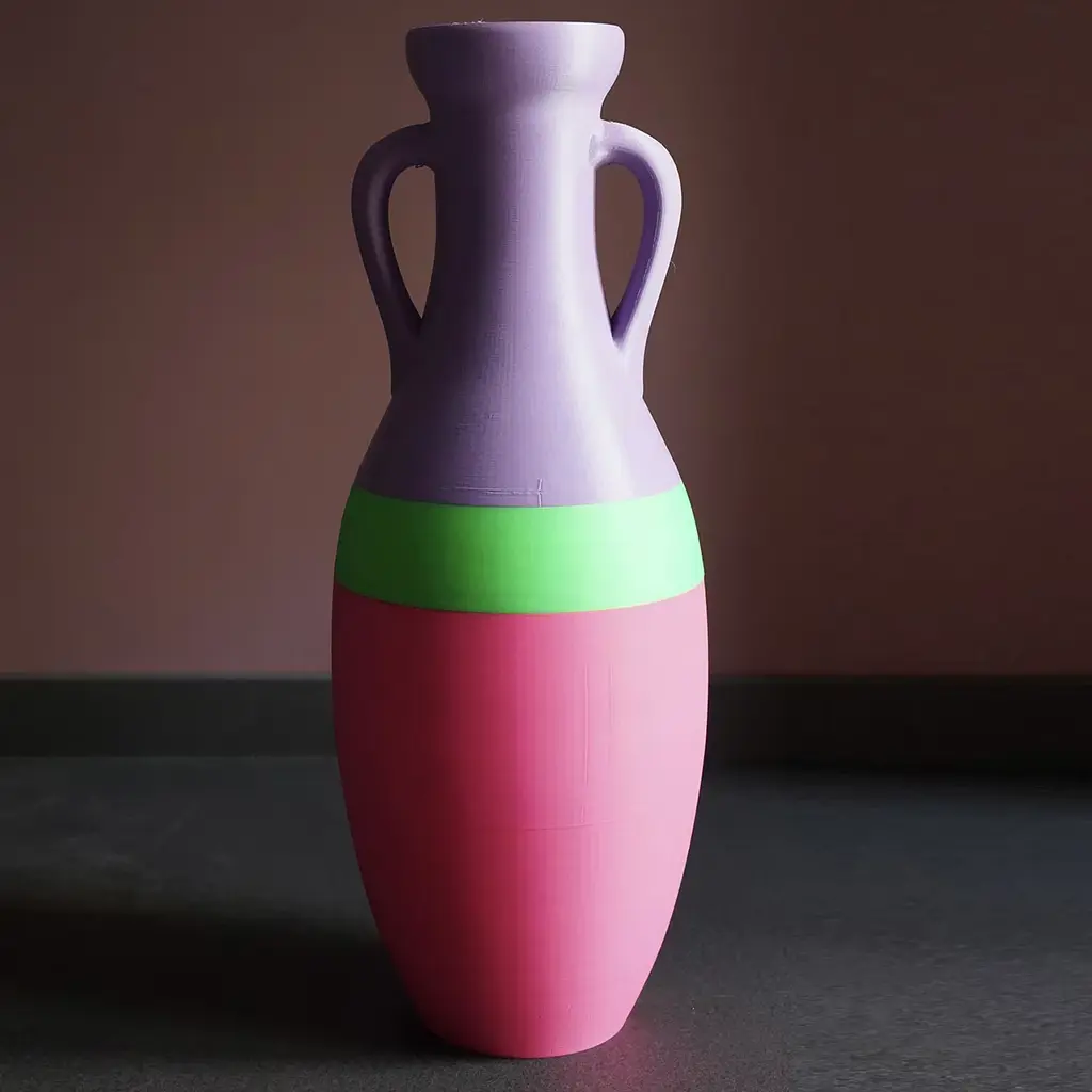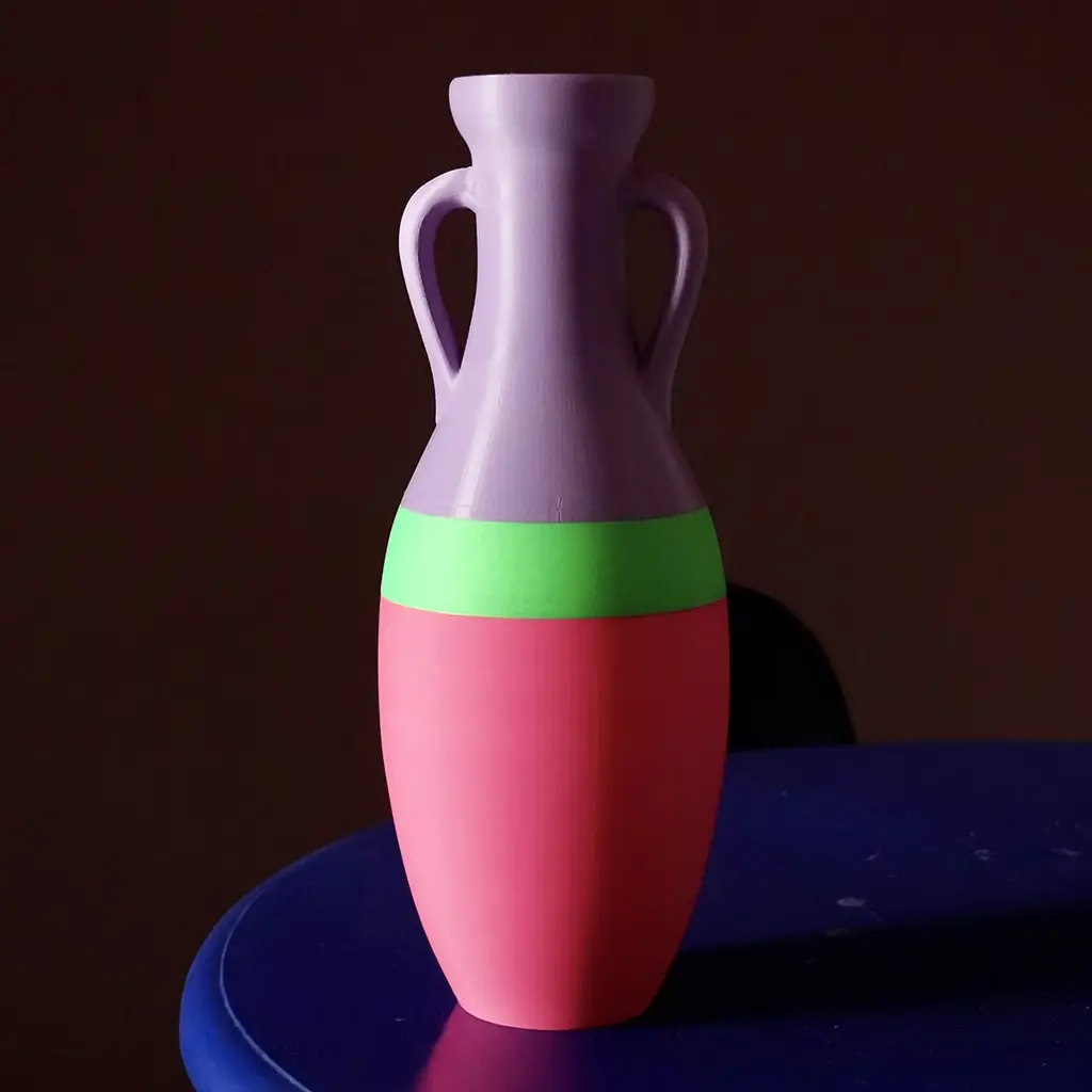 This vase is a pop reinterpretation of the archetypal shape of Roman amphorae. The main inspiration for this object has been Montestaccio's archeological site studied by Heinrich Dressel. The vase is produced with the use of 3D printing and the best quality of PLA (thermoplastic derived from renewable resources, compostable in industrial facilities). The sustainable and elegant vase is the perfect design for a chic enviroment.