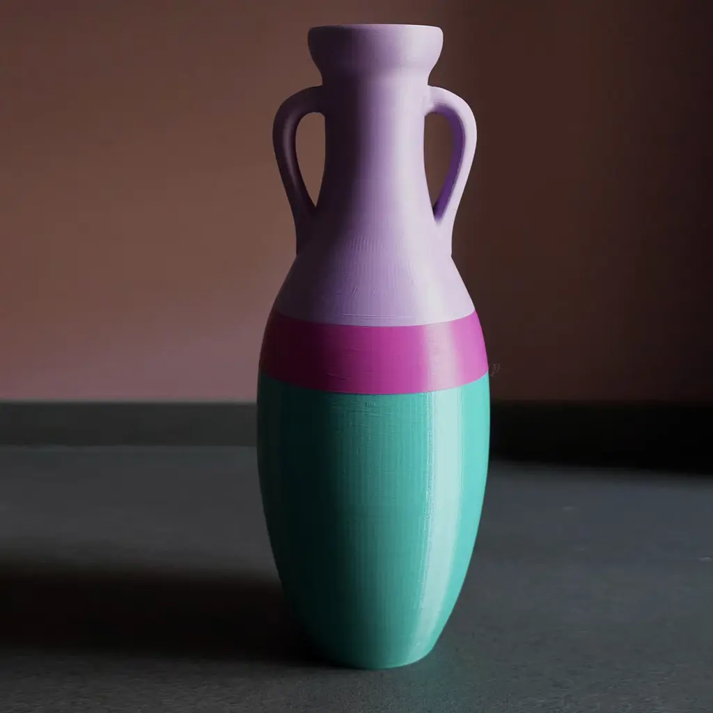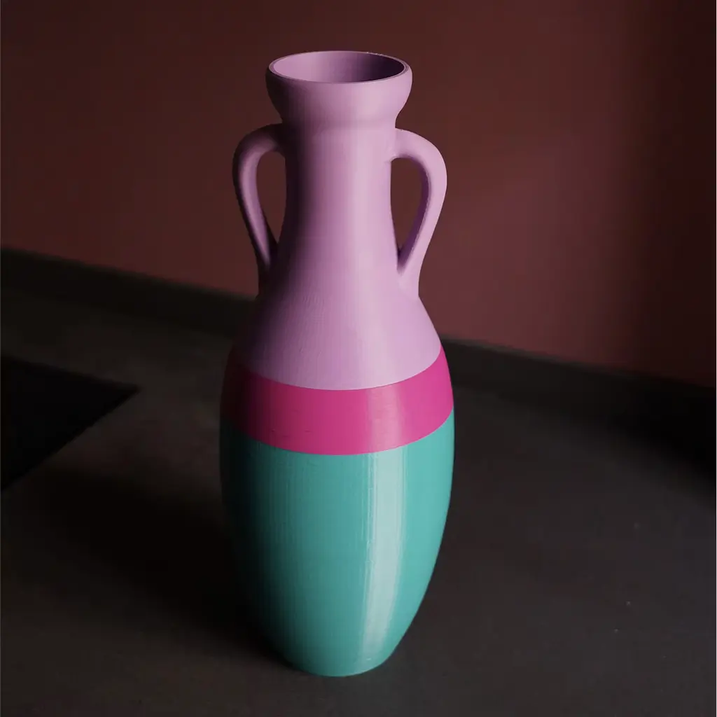 This vase is a pop reinterpretation of the archetypal shape of Roman amphorae. The main inspiration for this object has been Montestaccio's archeological site studied by Heinrich Dressel. The vase is produced with the use of 3D printing and the best quality of PLA (thermoplastic derived from renewable resources, compostable in industrial facilities). The sustainable and elegant vase is the perfect design for a chic enviroment.