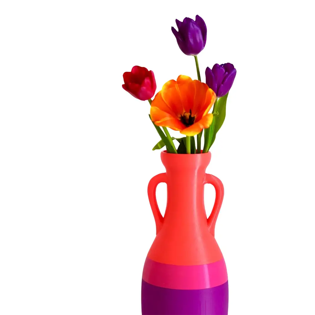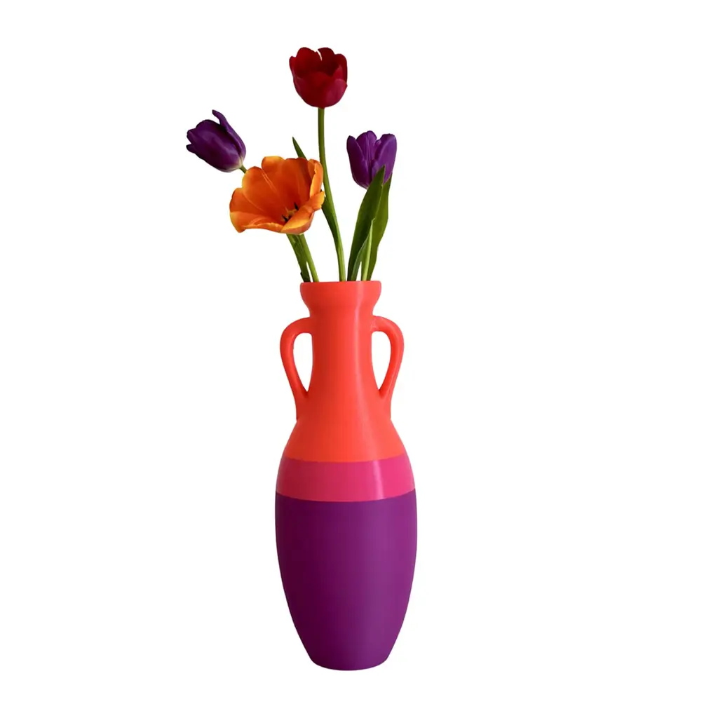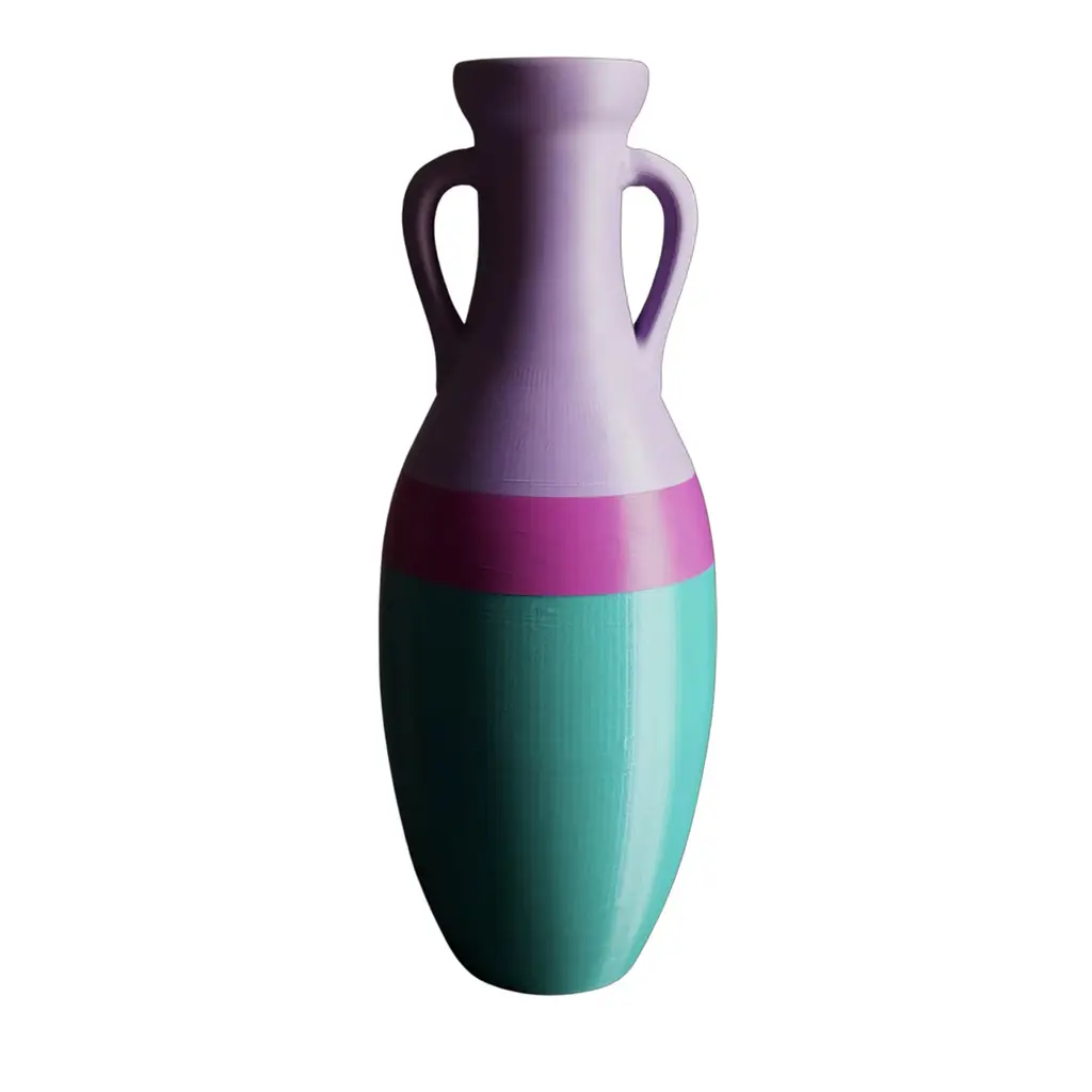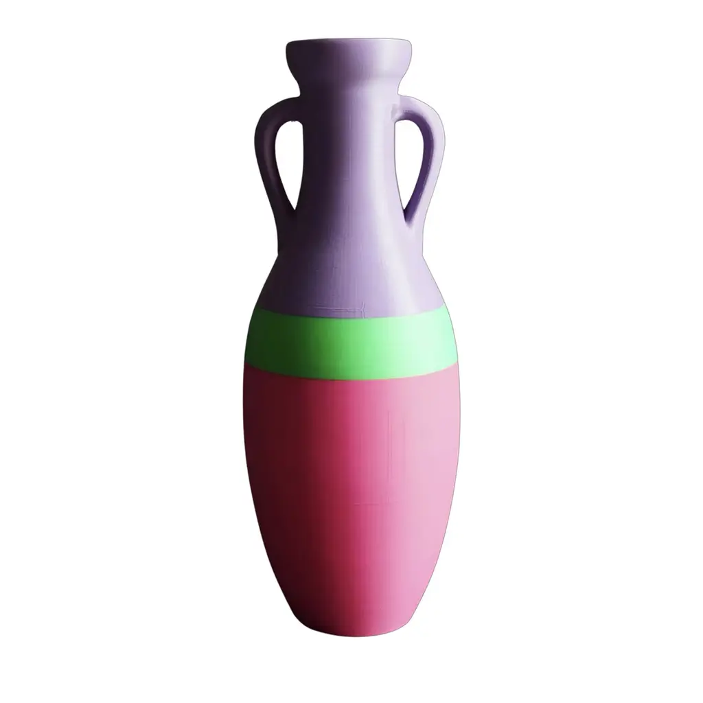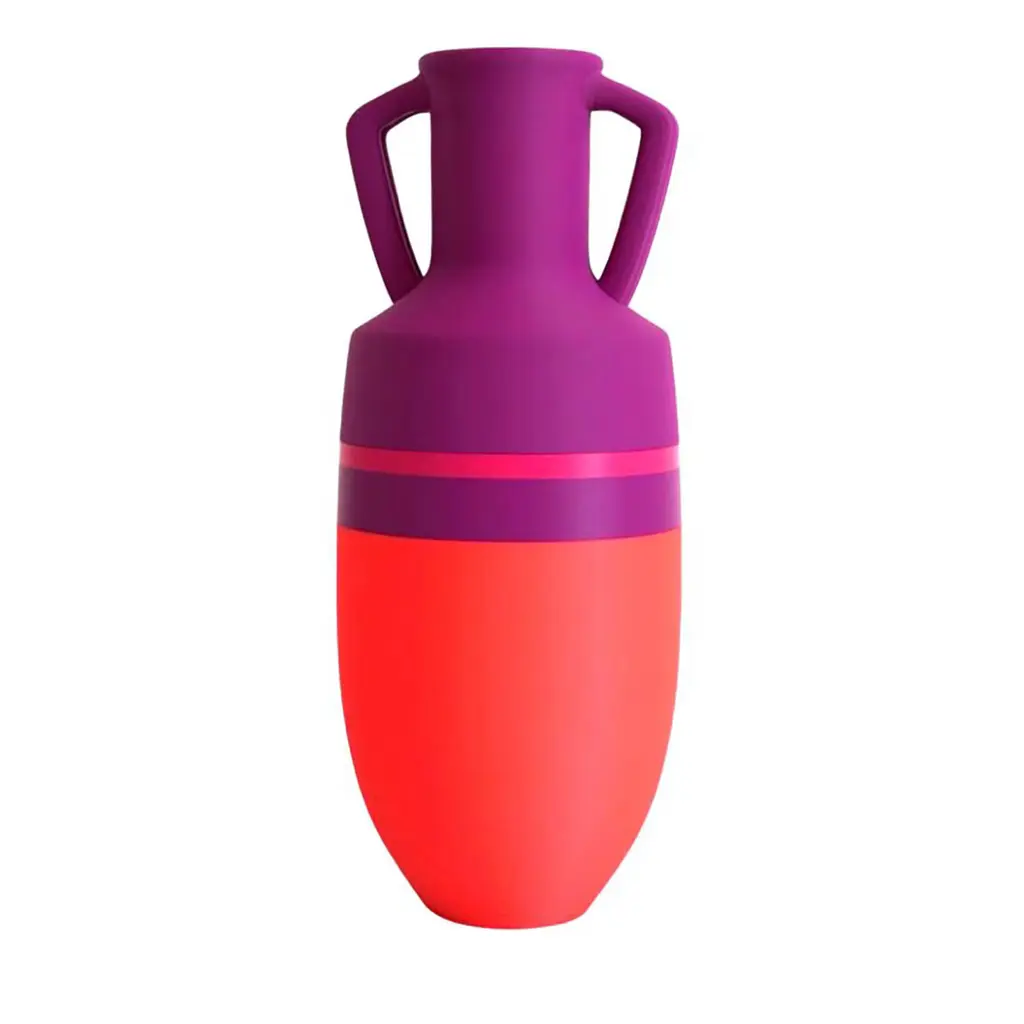 This vase is a pop reinterpretation of the archetypal shape of Roman amphorae. The main inspiration for this object has been Montestaccio's archeological site studied by Heinrich Dressel. The vase is produced with the use of 3D printing and the best quality of PLA (thermoplastic derived from renewable resources, compostable in industrial facilities). The sustainable and elegant vase is the perfect design for a chic enviroment.