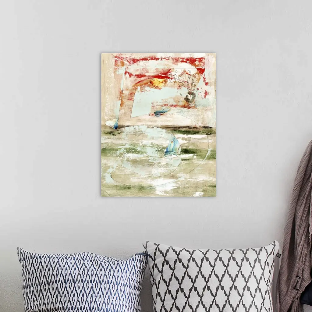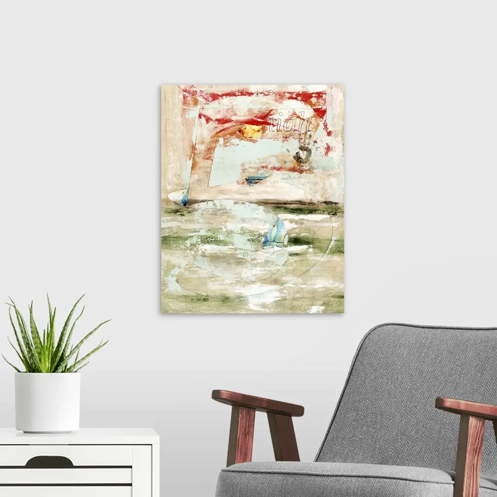 Abstract art with a faint tracing of the number 5 in the middle with "high" written at the top on a green, tan, red, yellow, and blue weathered background.