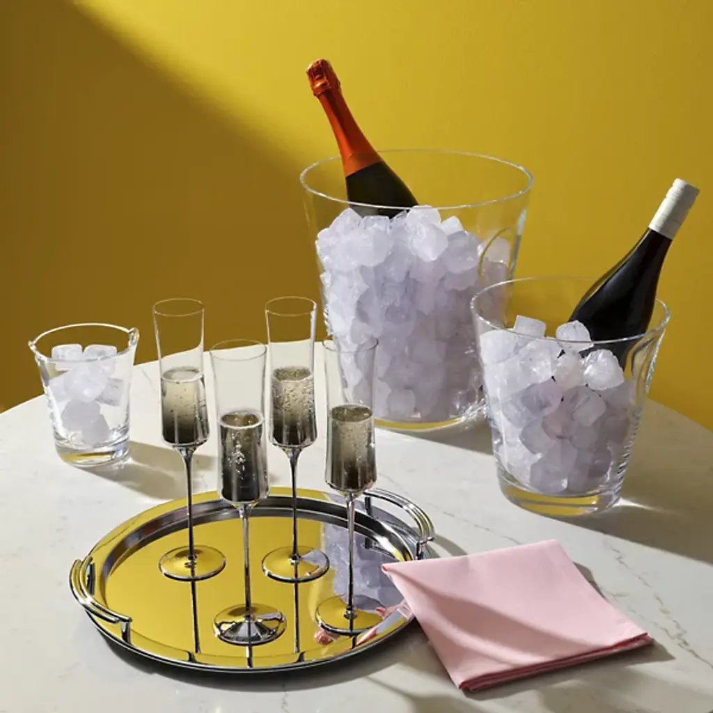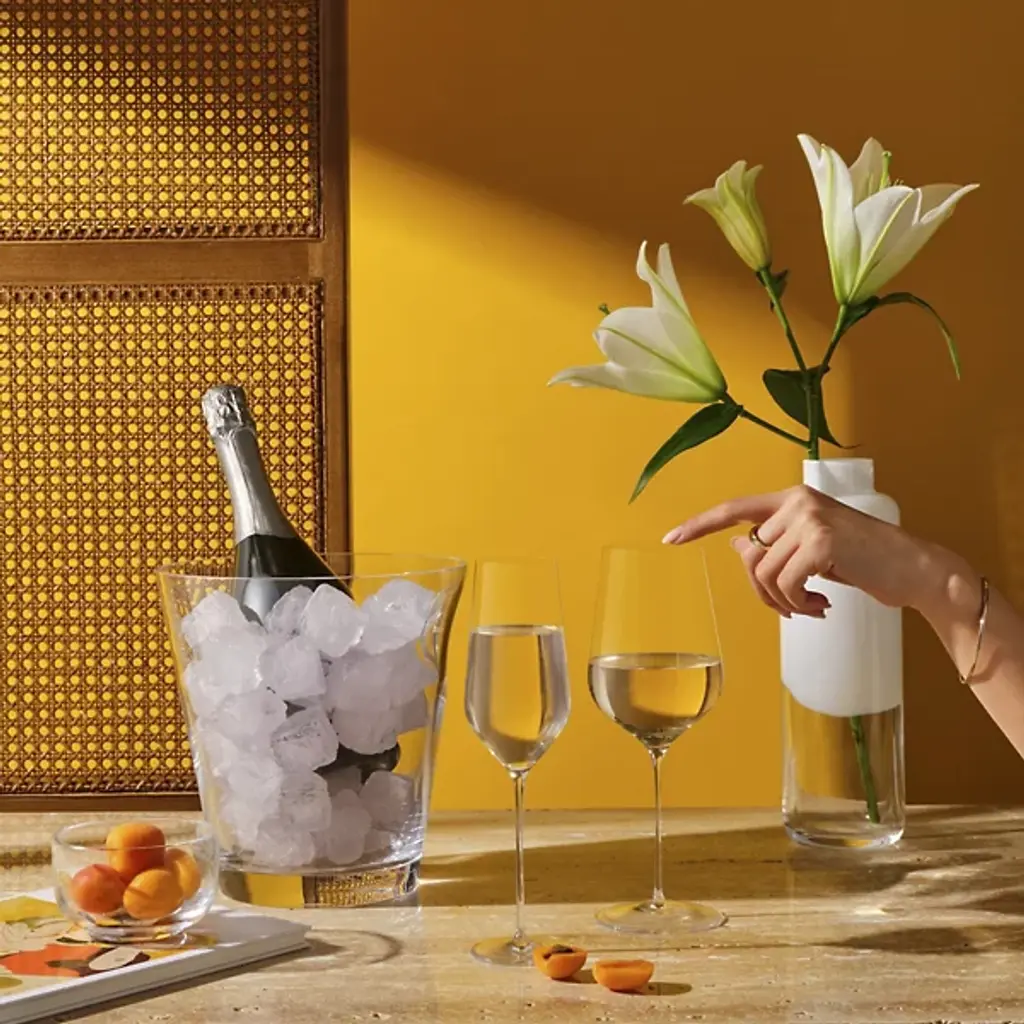 The Glacier Champagne Cooler from Nude presents a strong architectural form that contrasts with its delicate crystal composition through clean geometric lines. Crafted in Turkey from lead-free crystal using traditional methods, the design features hand-pressed concavities that enhance grip while adding dimensional interest to the surface. The sharp yet comfortable contours ensure reliable handling while maintaining contemporary aesthetic appeal. This cooler balances substantial presence with crystal transparency, creating an ice vessel that serves both practical chilling needs and table presentation through its sculptural qualities.