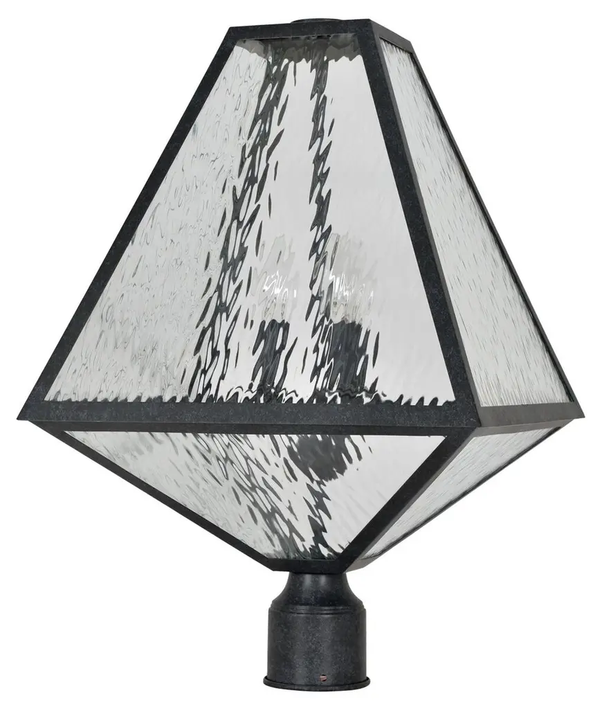 Inspired by the calving icebergs of Antarctica, this angular post lamp is crafted of steel with a black charcoal finish and rippled water-glass panels, bringing modern, sculptural appeal to any outdoor space. Hardwired. Fits any standard three-inch light pole (not included).