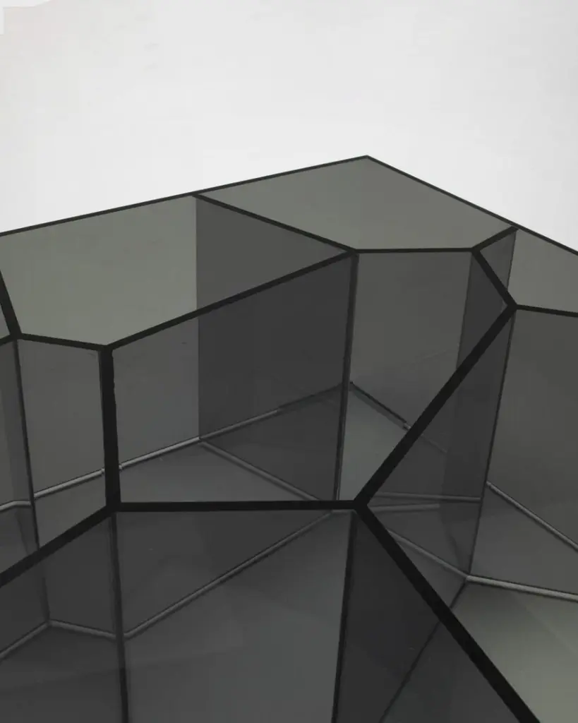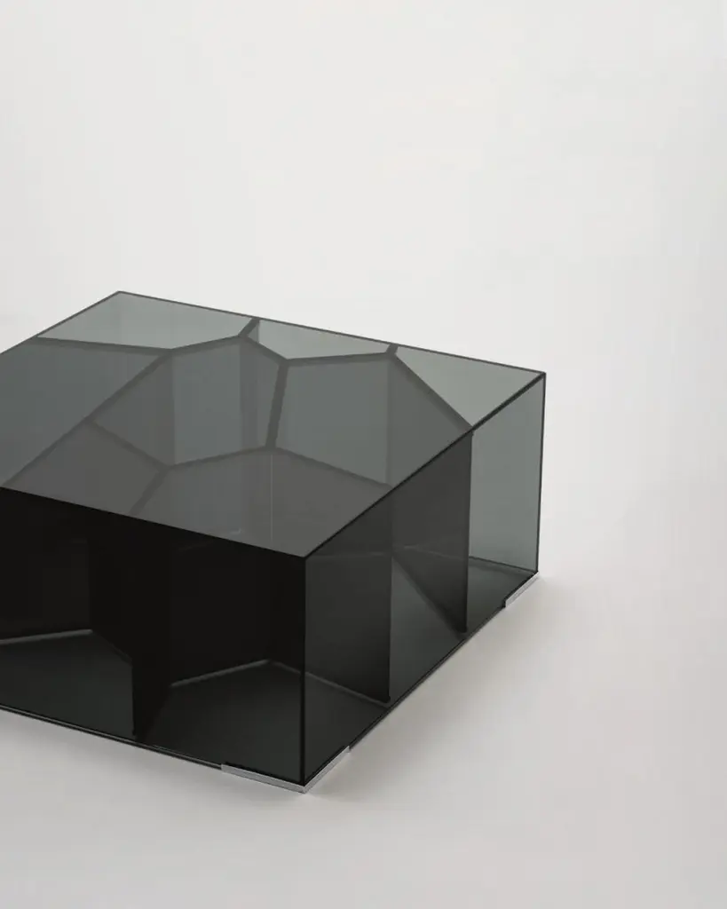 Series of parallelepiped shaped low tables in 6 mm tempered smoked glass, glued 45°, to whose inside contains a complex honeycomb structure. Four little chromiumplated feet slightly raise up the volume from the ground. Available in two different sizes.Available finishes: 501.FumèDIMENSIONS:L60 x W60 x H27 cm