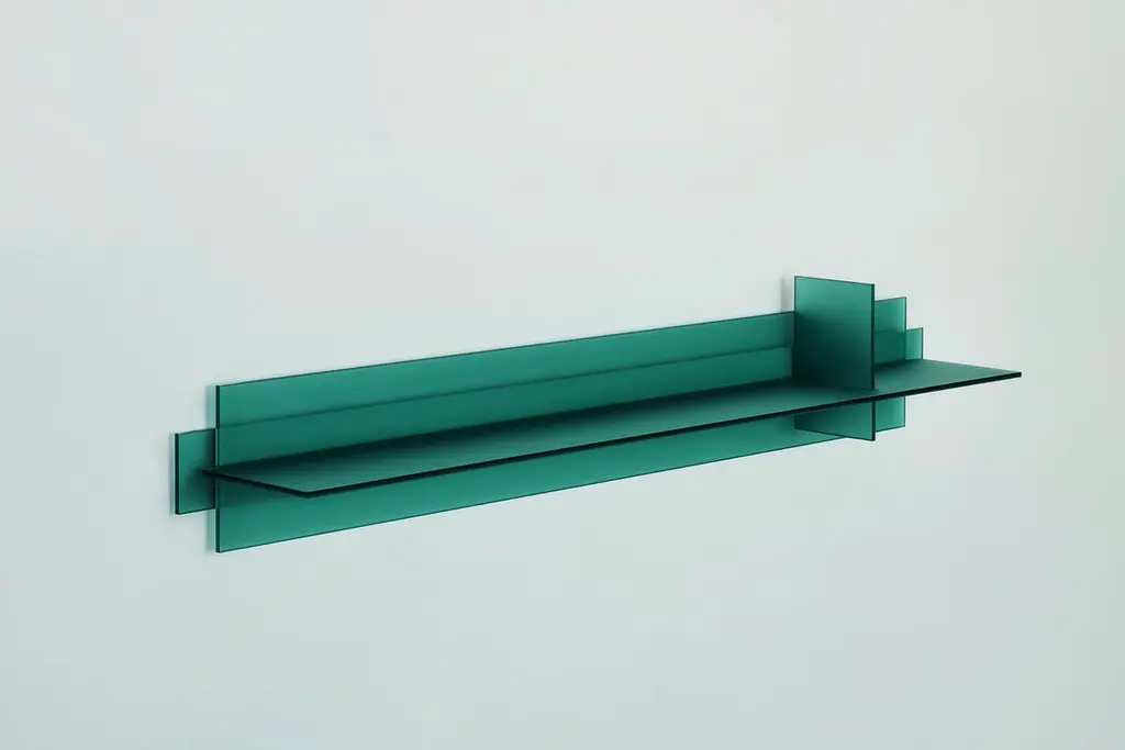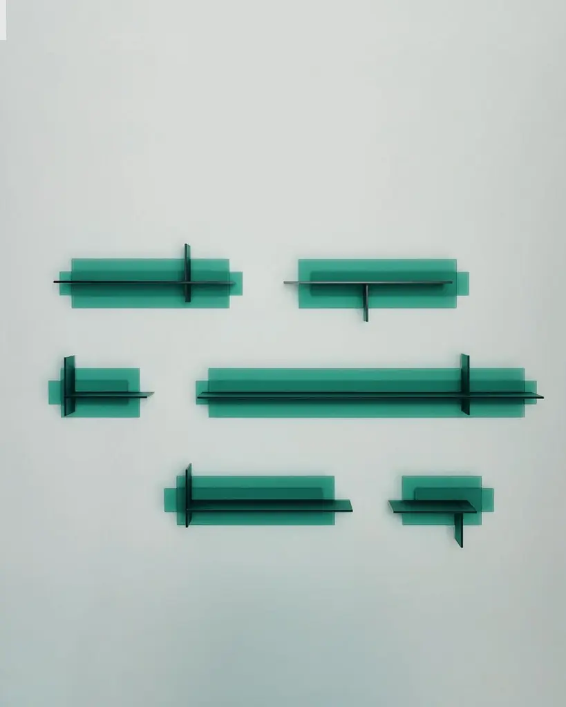 Collection of furniture consisting of shelves, console and low table, completely made of a special 10 mm tempered double-sided green acid-etched glass, or, in 6+6 mm laminated double-sided acidetched extralight glass. Each item is a composition of interlocked and overlapping glass sheets which, through a special UV bonding method, give shape to pure and refined sculptural furnishing elements characterized by a rigorous form. The shelves can be hung upside down.Available in different version:Finish: green glass, extralight glassDifferent configuration available, please inquire with usDIMENSIONS:L 173 - P 28 - H 31,5 cm