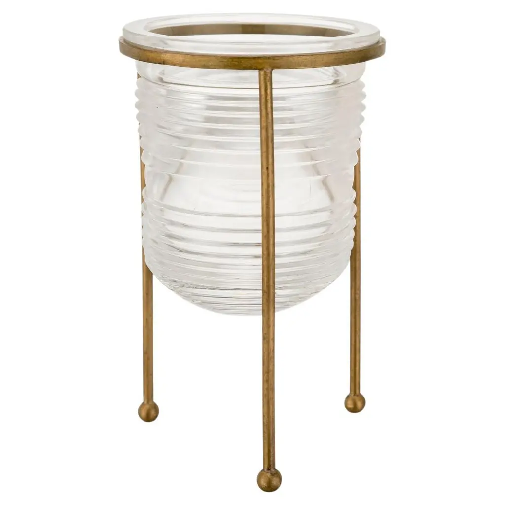 Showcased s a purely decorative object or as a pen- or candle holder, this exquisite piece is distinguished by an intriguing combination of materials, hues, and textures. Handcrafted of ribbed glass boasting a transparent hue, it rests on a brass structure with three legs supported by tiny spherical feet.