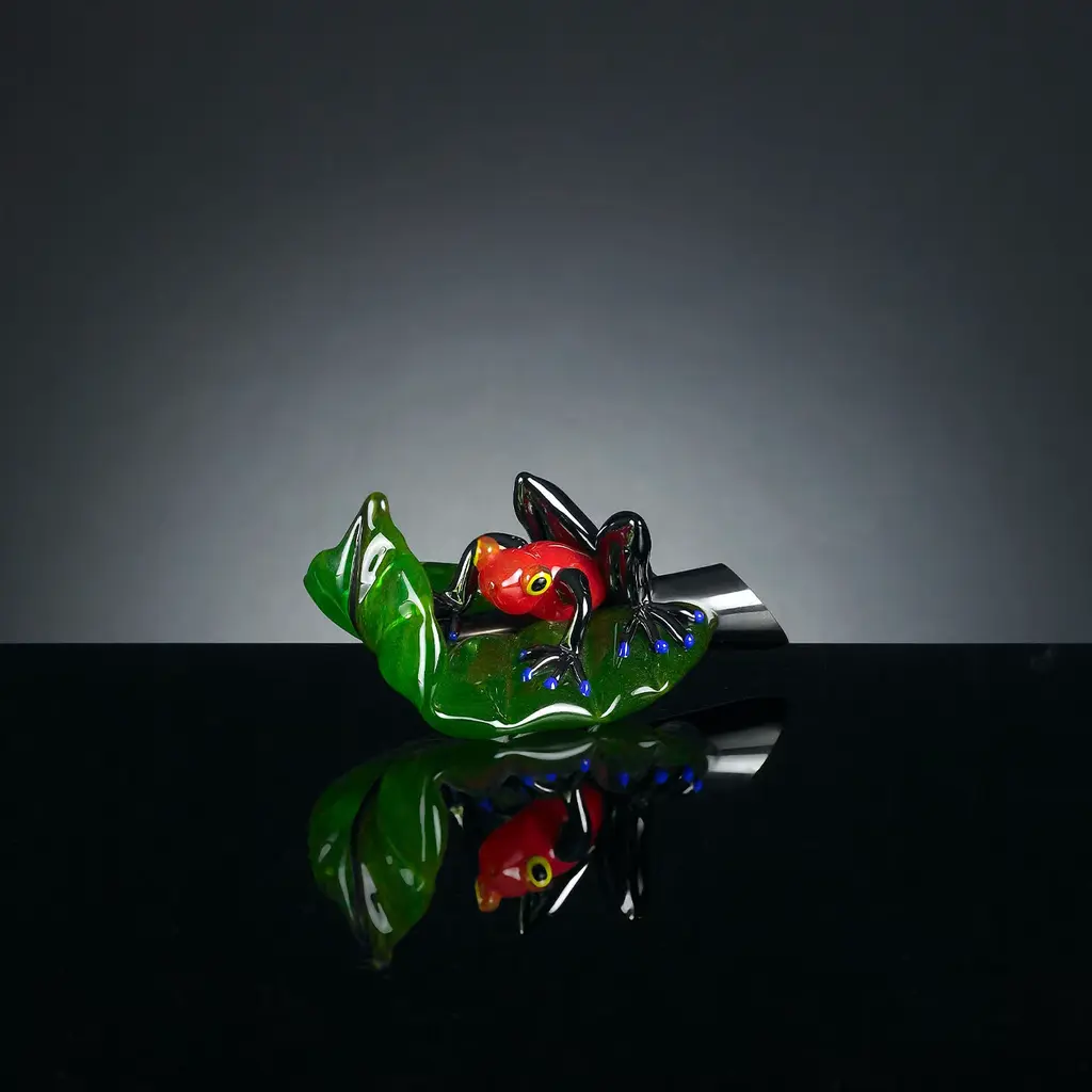 More than just a decorative object, this blown glass objet d'art showcases a red frog with blue legs perched atop a curled green leaf. Part of a series of naturalistic figurines handcrafted by master artisans using traditional techniques, this charming collector's piece can be used as a paperweight for an office or private study desk.