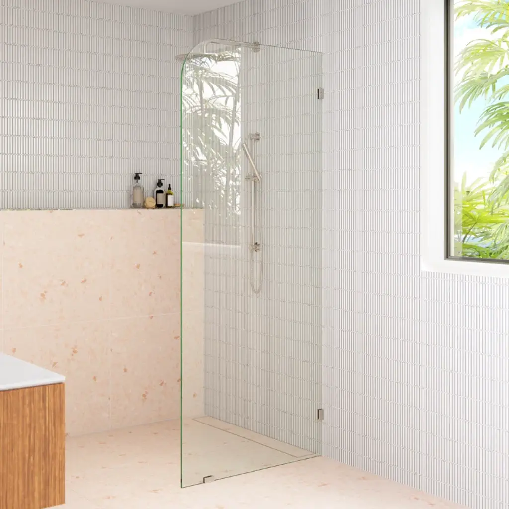 Enhance natural light and soften the edges of your bathroom with the Solaris, our stylish fixed shower panel. Taller than most competitor shower panels, each frameless 3/8” tempered glass panel comes in a standard 78” height. Glass is treated on both sides with EnduroShield coating, which aids in repelling water and soap residue, allowing the panels to be fully reversible. In addition, our superior quality solid brass hardware is available in a variety of color finishes to suit any bathroom. With our extensive range of fixed shower panel sizes, the sophisticated Solaris enclosure by Glass Warehouse features an elegantly curved silhouette that adds a sense of comfort and warmth to your space. Features: