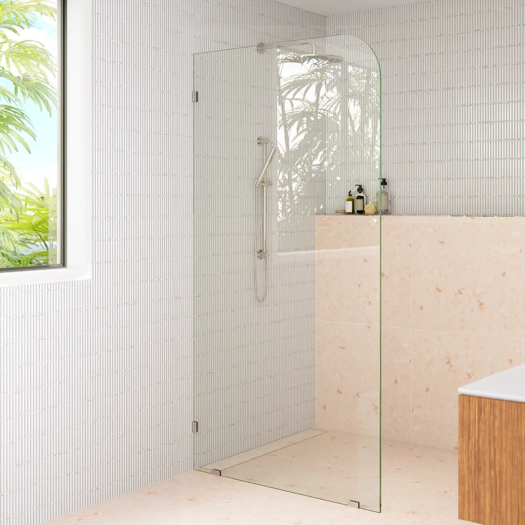 Enhance natural light and soften the edges of your bathroom with the Solaris, our stylish fixed shower panel. Taller than most competitor shower panels, each frameless 3/8” tempered glass panel comes in a standard 78” height. Glass is treated on both sides with EnduroShield coating, which aids in repelling water and soap residue, allowing the panels to be fully reversible. In addition, our superior quality solid brass hardware is available in a variety of color finishes to suit any bathroom. With our extensive range of fixed shower panel sizes, the sophisticated Solaris enclosure by Glass Warehouse features an elegantly curved silhouette that adds a sense of comfort and warmth to your space. Features: