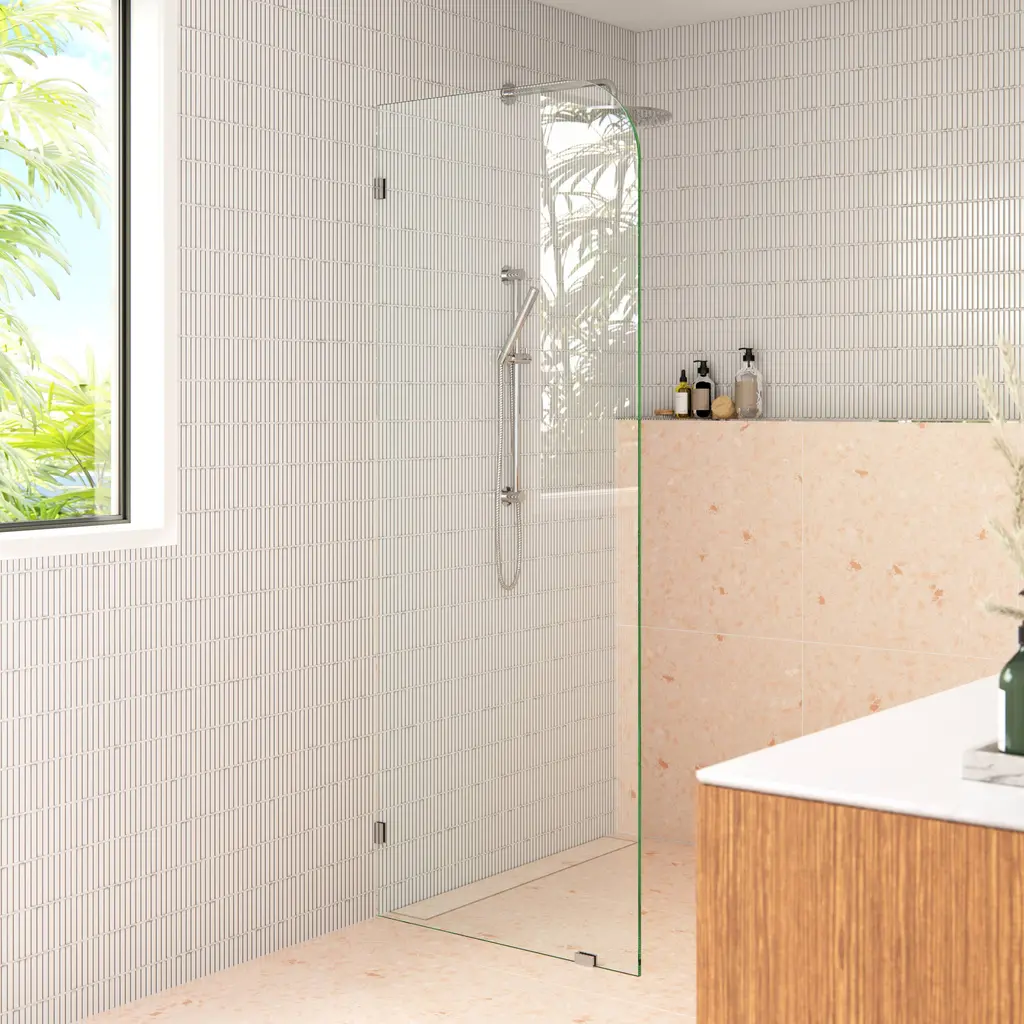 Enhance natural light and soften the edges of your bathroom with the Solaris, our stylish fixed shower panel. Taller than most competitor shower panels, each frameless 3/8” tempered glass panel comes in a standard 78” height. Glass is treated on both sides with EnduroShield coating, which aids in repelling water and soap residue, allowing the panels to be fully reversible. In addition, our superior quality solid brass hardware is available in a variety of color finishes to suit any bathroom. With our extensive range of fixed shower panel sizes, the sophisticated Solaris enclosure by Glass Warehouse features an elegantly curved silhouette that adds a sense of comfort and warmth to your space. Features: