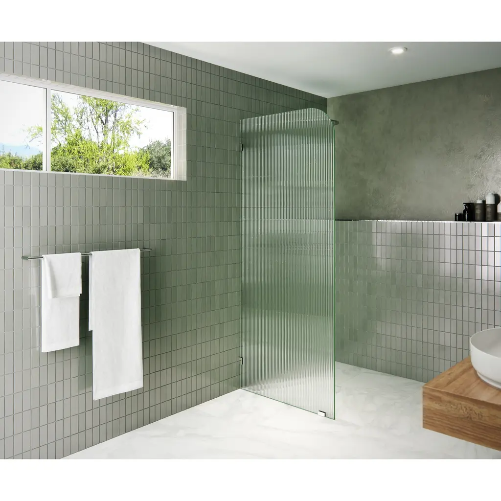 The Aurora, our elegant, fluted glass, fixed shower panel, diffuses the light in your bathroom while adding an element of privacy. Taller than most competitor shower enclosures, our frameless 3/8" tempered glass panels come in a standard 78" height. Glass is treated with EnduroShield coating, which aids in repelling water and soap residue. In addition, our superior quality solid brass hardware is available in a variety of color finishes to suit any bathroom. With our extensive range of fixed frameless glass panel sizes, the Aurora by Glass Warehouse features a classic, curved aesthetic that adds a timeless quality and a touch of old-school glamour to your bathroom. .