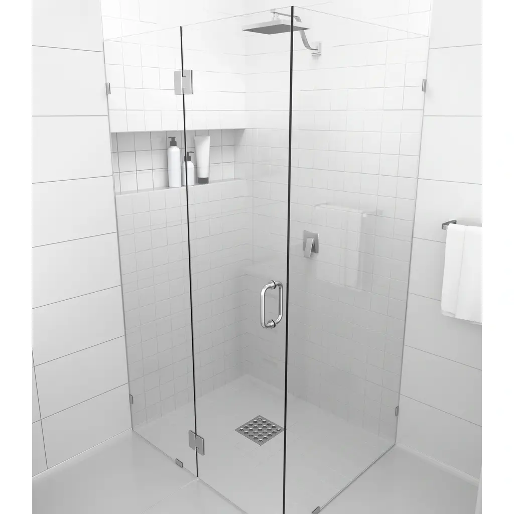 -Images do not show actual size/proportion-Measurement 1 = Height-Measurement 2 = Door + Hinge panel measurement-Measurement 3 = Return panel measurement Highlight the fixtures in your bathroom with the understated minimalism of a glass-hinged 90-degree corner shower enclosure. Taller than most competitor shower enclosures, our frameless 3/8" tempered glass panels come in a standard 78" height. At the same time, the flexibility of a glass-hinged panel allows room for wall accessories or a design that doesn't suit a wall-hung door. Glass is treated on both sides with EnduroShield coating, which aids in repelling water and soap residue, allowing the panels to be fully reversible. In addition, our superior quality solid brass hardware is available in a variety of color finishes to suit any bathroom. With our extensive range of frameless shower door and panel sizes, the Halo walk-in enclosure by Glass Warehouse is perfect for any space, creating a light and airy feel to your bathroom.