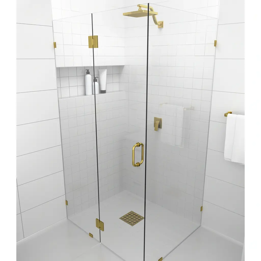 -Images do not show actual size/proportion-Measurement 1 = Height-Measurement 2 = Door + Hinge panel measurement-Measurement 3 = Return panel measurement Highlight the fixtures in your bathroom with the understated minimalism of a glass-hinged 90-degree corner shower enclosure. Taller than most competitor shower enclosures, our frameless 3/8" tempered glass panels come in a standard 78" height. At the same time, the flexibility of a glass-hinged panel allows room for wall accessories or a design that doesn't suit a wall-hung door. Glass is treated on both sides with EnduroShield coating, which aids in repelling water and soap residue, allowing the panels to be fully reversible. In addition, our superior quality solid brass hardware is available in a variety of color finishes to suit any bathroom. With our extensive range of frameless shower door and panel sizes, the Halo walk-in enclosure by Glass Warehouse is perfect for any space, creating a light and airy feel to your bathroom.