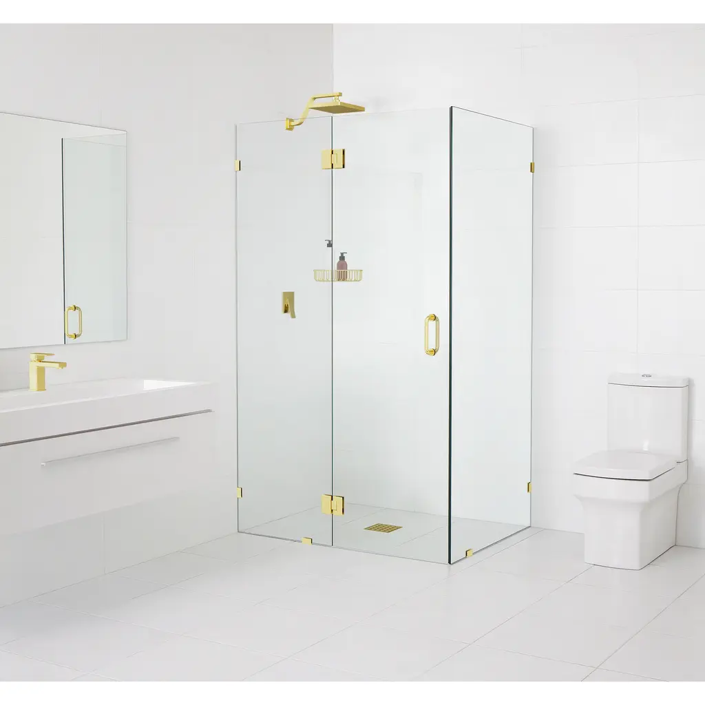 -Images do not show actual size/proportion-Measurement 1 = Height-Measurement 2 = Door + Hinge panel measurement-Measurement 3 = Return panel measurement Highlight the fixtures in your bathroom with the understated minimalism of a glass-hinged 90-degree corner shower enclosure. Taller than most competitor shower enclosures, our frameless 3/8" tempered glass panels come in a standard 78" height. At the same time, the flexibility of a glass-hinged panel allows room for wall accessories or a design that doesn't suit a wall-hung door. Glass is treated on both sides with EnduroShield coating, which aids in repelling water and soap residue, allowing the panels to be fully reversible. In addition, our superior quality solid brass hardware is available in a variety of color finishes to suit any bathroom. With our extensive range of frameless shower door and panel sizes, the Halo walk-in enclosure by Glass Warehouse is perfect for any space, creating a light and airy feel to your bathroom.