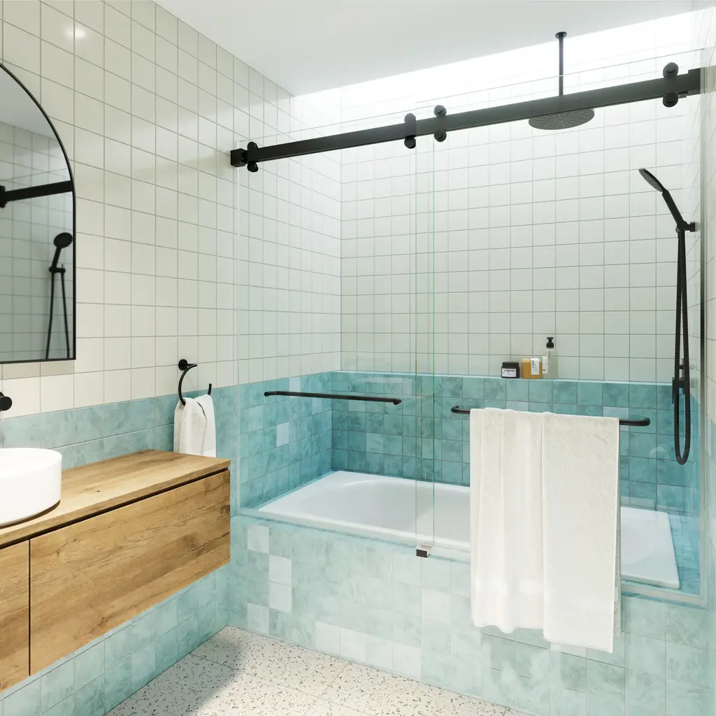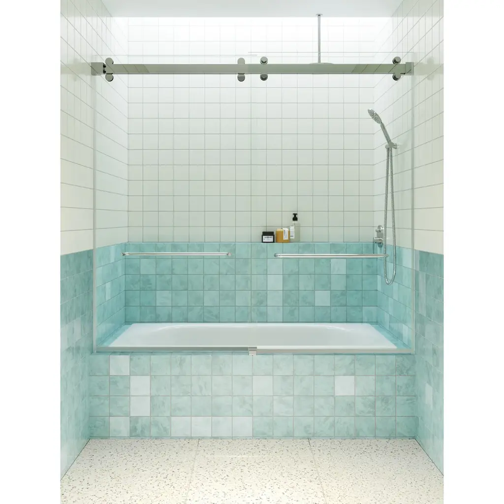 For an affordable upgrade to your bathroom without compromising on quality or design, the Polaris, our double sliding (bypass) shower doors, will enhance the natural light in your bathroom. Our frameless 3/8" tempered glass panels come in a 60" or 66" height with two sliding barn-style doors with dual towel bars. Glass is treated on both sides with coating, which aids in repelling water and soap residue, allowing the panels to be fully reversible. The rolling mechanism is beautifully engineered and finished with square hardware, which will modernize the overall aesthetic of your space. In addition, our superior quality stainless steel hardware is available in a variety of color finishes to suit any bathroom.Glass Warehouse B-2DSL60-66 Features:Glass Warehouse B-2DSL60-66 Specifications: