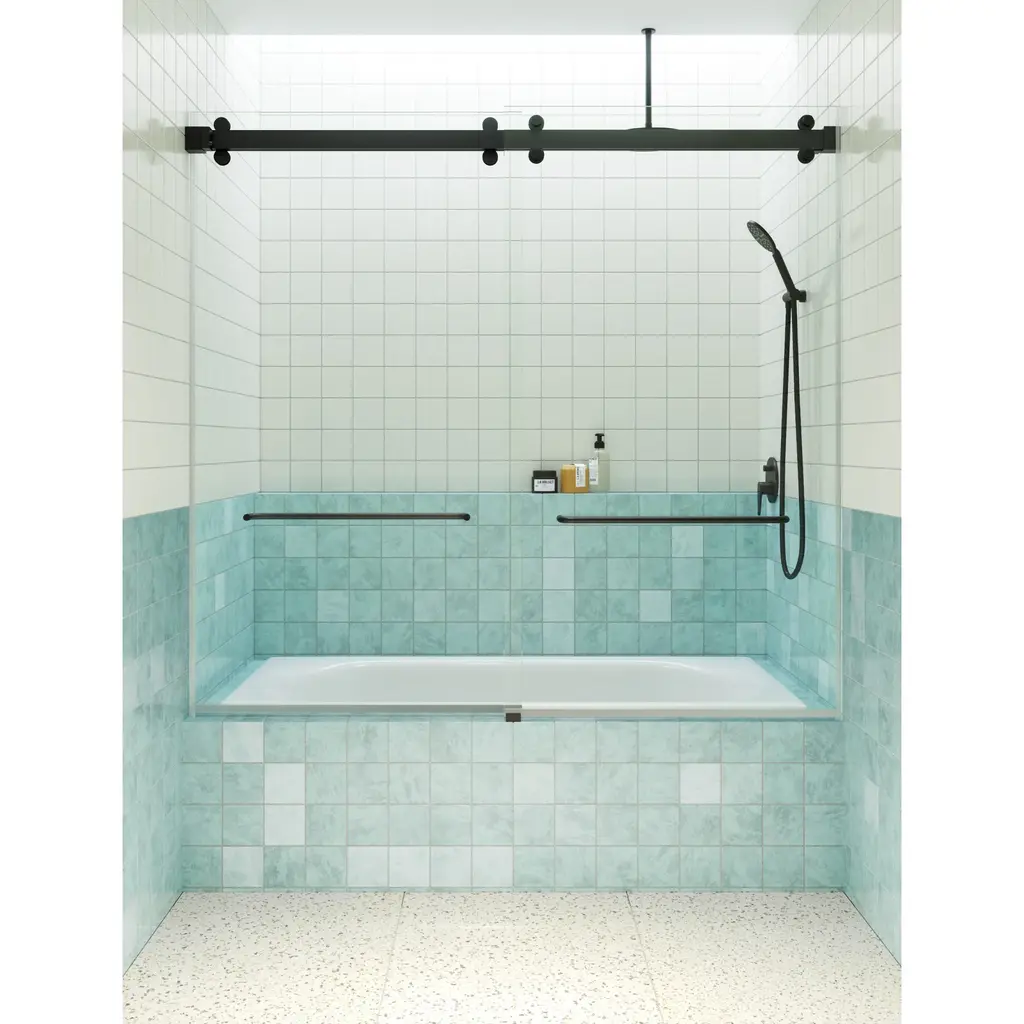 For an affordable upgrade to your bathroom without compromising on quality or design, the Polaris, our double sliding (bypass) shower doors, will enhance the natural light in your bathroom. Our frameless 3/8" tempered glass panels come in a 60" or 66" height with two sliding barn-style doors with dual towel bars. Glass is treated on both sides with coating, which aids in repelling water and soap residue, allowing the panels to be fully reversible. The rolling mechanism is beautifully engineered and finished with square hardware, which will modernize the overall aesthetic of your space. In addition, our superior quality stainless steel hardware is available in a variety of color finishes to suit any bathroom.Glass Warehouse B-2DSL60-66 Features:Glass Warehouse B-2DSL60-66 Specifications: