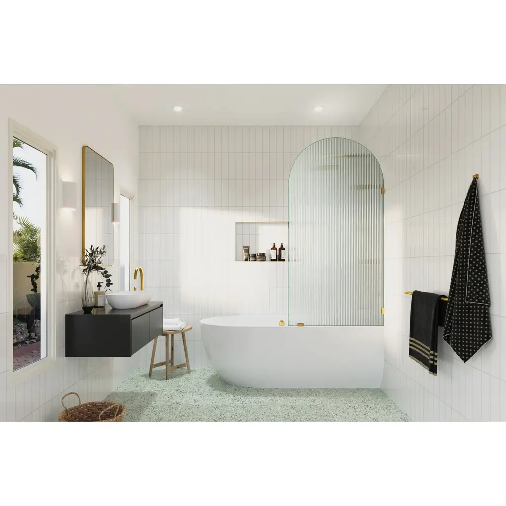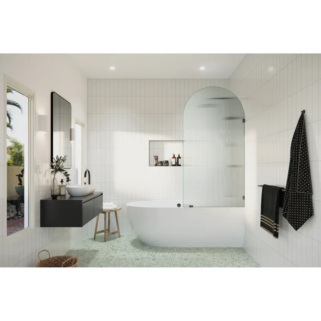 Soften the light and the edges in your bathroom with our stunning Maven arch textured frameless glass bathtub panels. Each 3/8” tempered glass panel comes in a standard 66.75” height and is treated with coating, which aids in repelling water and soap residue. In addition, our superior quality solid brass hardware is available in a variety of color finishes to suit any bathroom. With an extensive range of fixed bathtub panel sizes available, the Maven shower enclosure by Glass Warehouse adds both a touch of luxury and a timeless aesthetic to your bathroom. At the same time, the extra height of this premium design brings a high-end, custom-made feel.Glass Warehouse B-FL-ARC-34 Features:Glass Warehouse B-FL-ARC-34 Specifications: