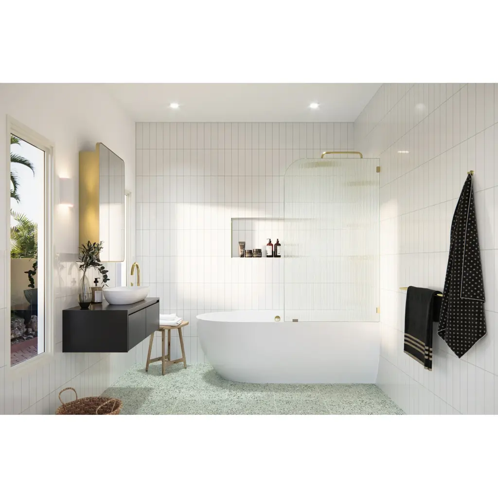The Aurora, our elegant, fluted glass, fixed bathtub shower panel, diffuses the light in your bathroom while adding an element of privacy. Each frameless 3/8” tempered glass panel comes in a standard 58.25” height and is treated with coating, which aids in repelling water and soap residue. In addition, our superior quality solid brass hardware is available in a variety of color finishes to suit any bathroom. With our extensive range of fixed frameless glass panel sizes, the Aurora shower enclosure by Glass Warehouse features a classic, curved aesthetic that adds a timeless quality and a touch of old-school glamour to your bathroom.Glass Warehouse B-FL-RAD-30-R Features:Glass Warehouse B-FL-RAD-30-R Specifications: