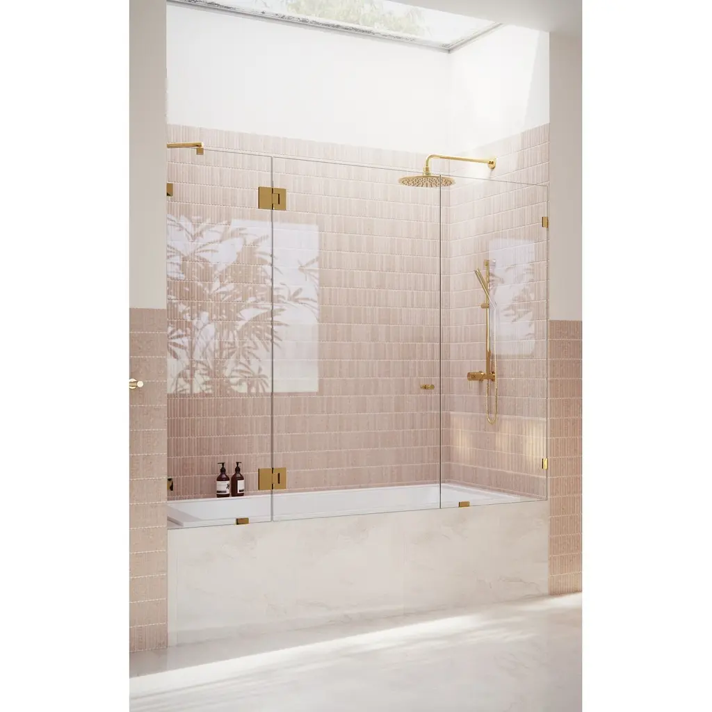 The Stellar is a beautiful, three-panel, glass-hinged bathtub shower enclosure that adds openness and an element of elegance and luxury to your bathroom. Each frameless 3/8” tempered glass panel comes in a standard 58.25” height with the door positioned in the center to allow easy access into the bathtub, leaving plenty of room for wall accessories. Glass is treated on both sides with EnduroShield coating, which aids in repelling water and soap residue, allowing the panels to be fully reversible. In addition, the extensive collection of frameless bathtub shower doors and panels feature superior quality solid brass hardware in a variety of color finishes to suit any bathroom. With a wide range of panel sizes available, the Stellar by Glass Warehouse is the perfect model to fully enclose your bathtub.Glass Warehouse B-GHF-70.75 Features:Glass Warehouse B-GHF-70.75 Specifications: