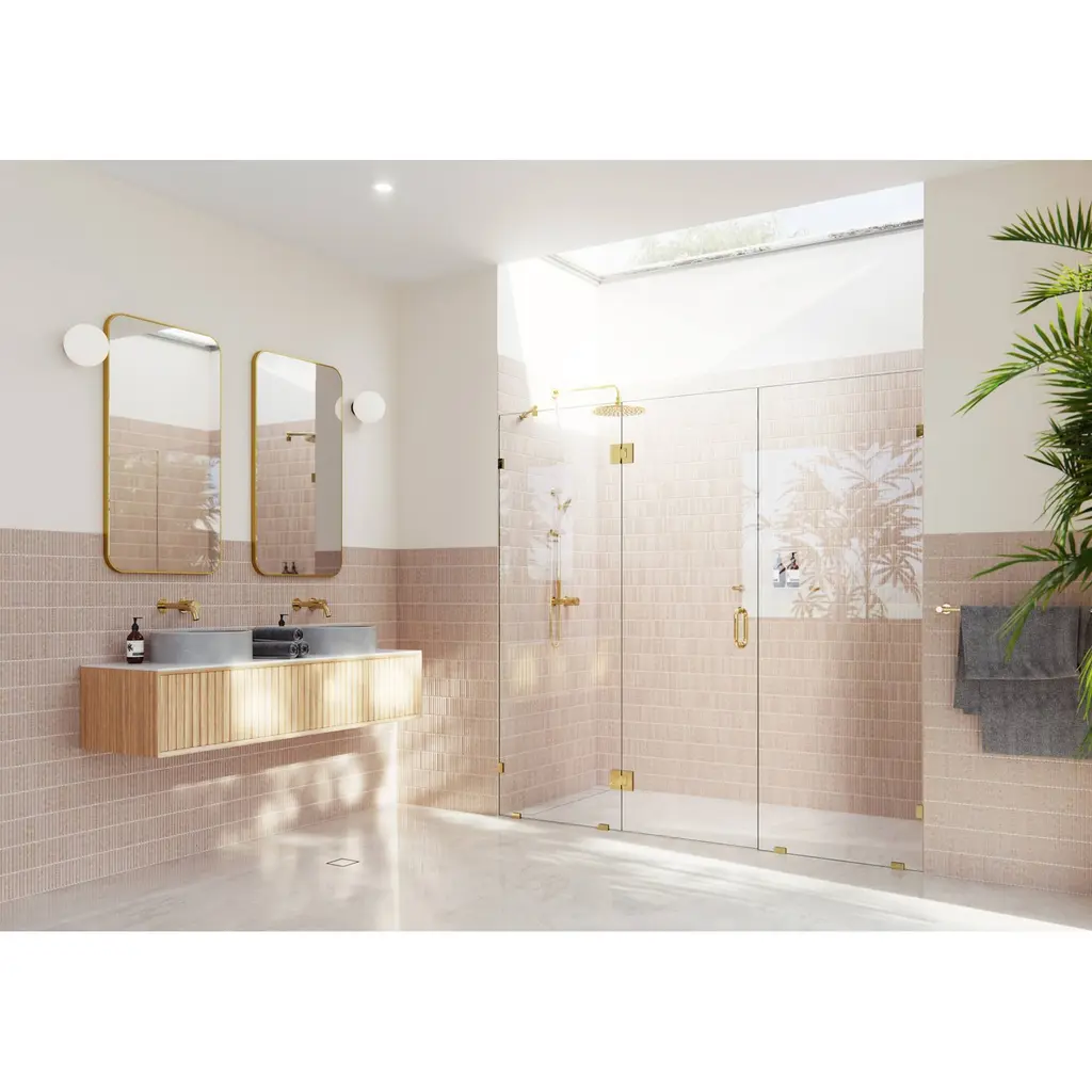 The Stellar is a beautiful, three-panel, glass-hinged shower enclosure that adds openness and an element of elegance and luxury to your bathroom. Taller than most competitor shower enclosures, each frameless 3/8" tempered glass panel comes in a standard 78" height. At the same time, the door is positioned in the center to allow easy access and space for wall accessories or a design that doesn't suit a wall-hung door. Glass is treated on both sides with EnduroShield coating, which aids in repelling water and soap residue, allowing the panels to be fully reversible. In addition, the superior quality solid brass hardware is available in a variety of color finishes to suit any bathroom. With extensive range of frameless shower doors and panel sizes, the Stellar by Glass Warehouse is the perfect model to suit a dual shower or to span a wider shower enclosure.Glass Warehouse GHF-82 Features:Glass Warehouse GHF-82 Specifications: